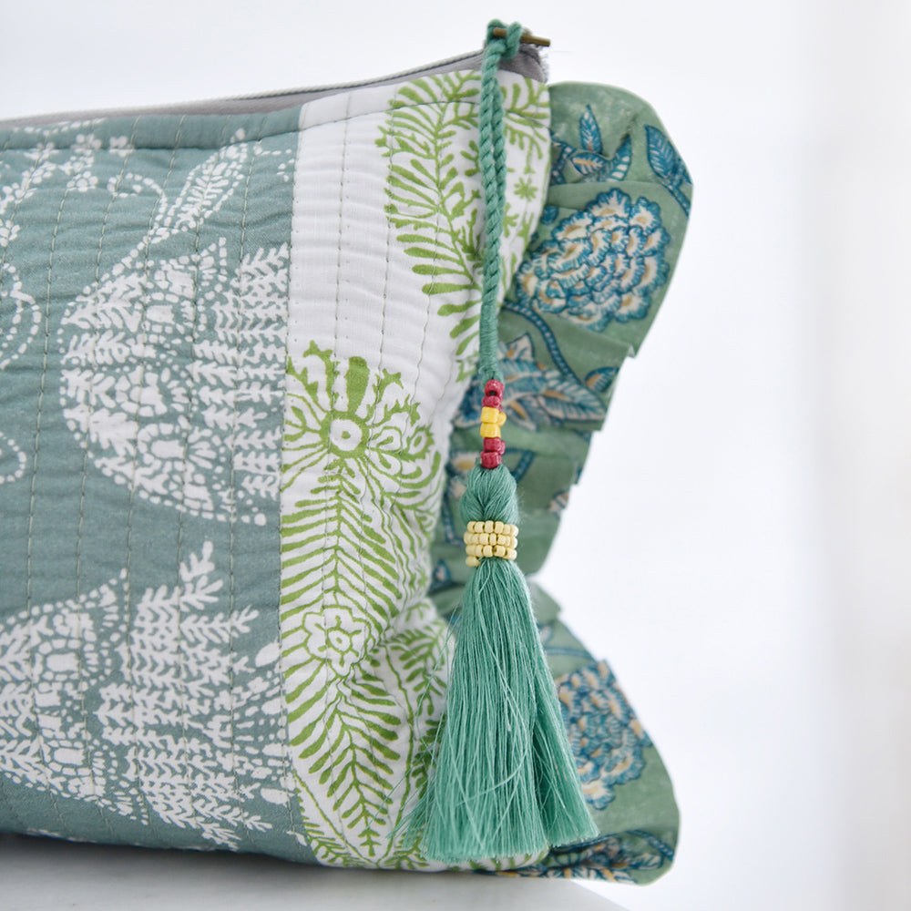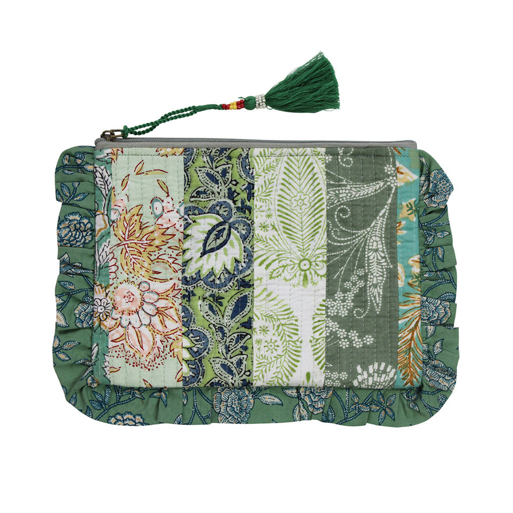 The make up bag has a green mixed fabric patchwork style print on the front and back and a contrasting floral ruffle trim around the edge, the pouch is finished with a mid green tassel zip pull.