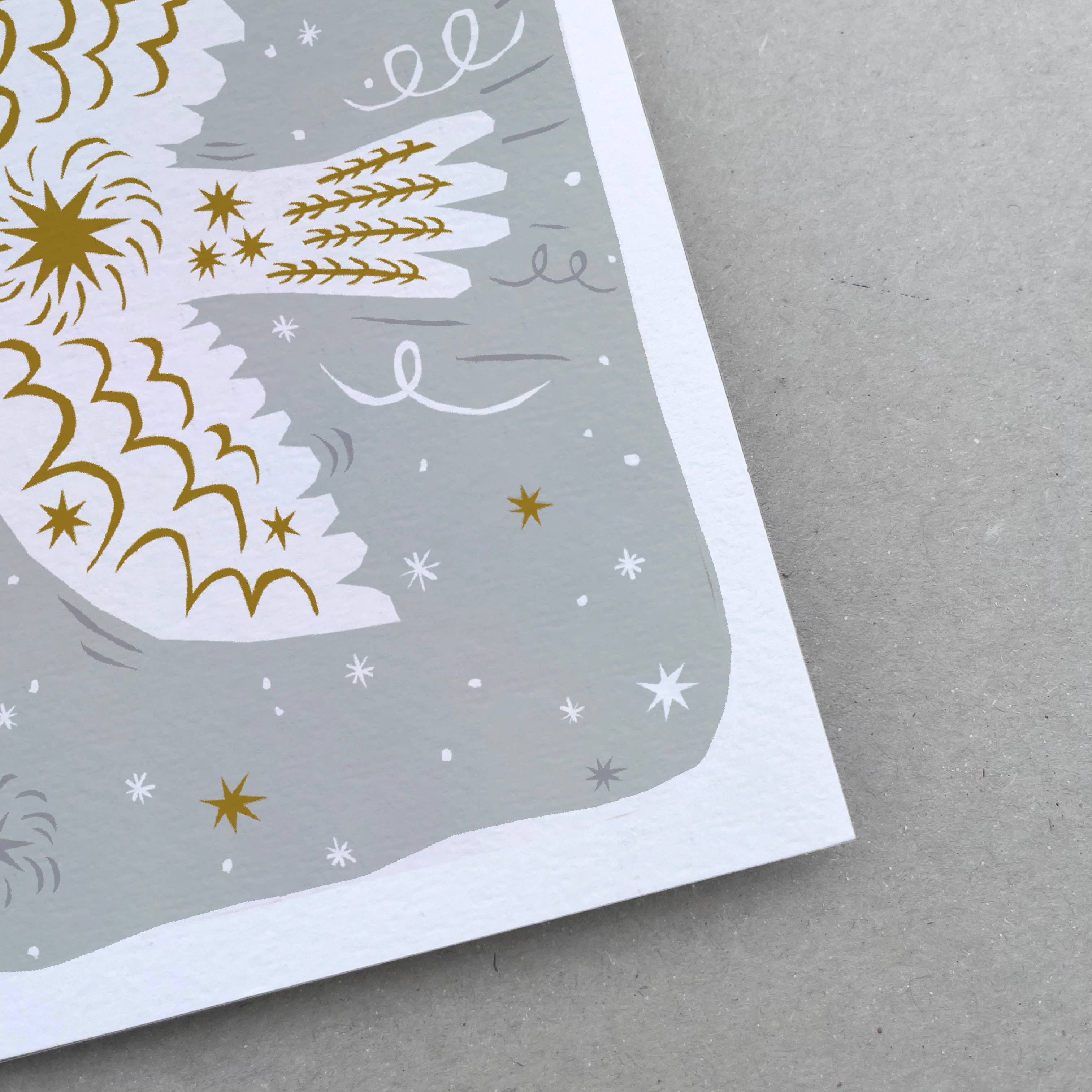 A card inspired by frosty days and twinkling lights. A friend brings a gift through the snow filled sky. Would make a lovely Christmas card ✨