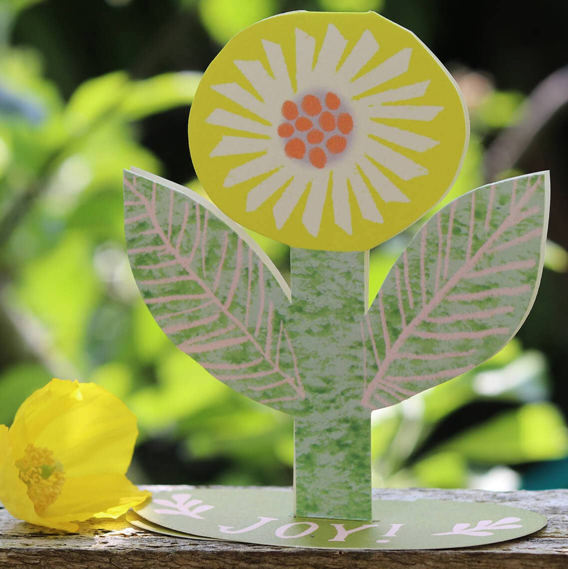 A sunny yellow flower that brings Joy! This beautiful yellow flower card folds out to become free standing with the message 'Joy!' on the base.