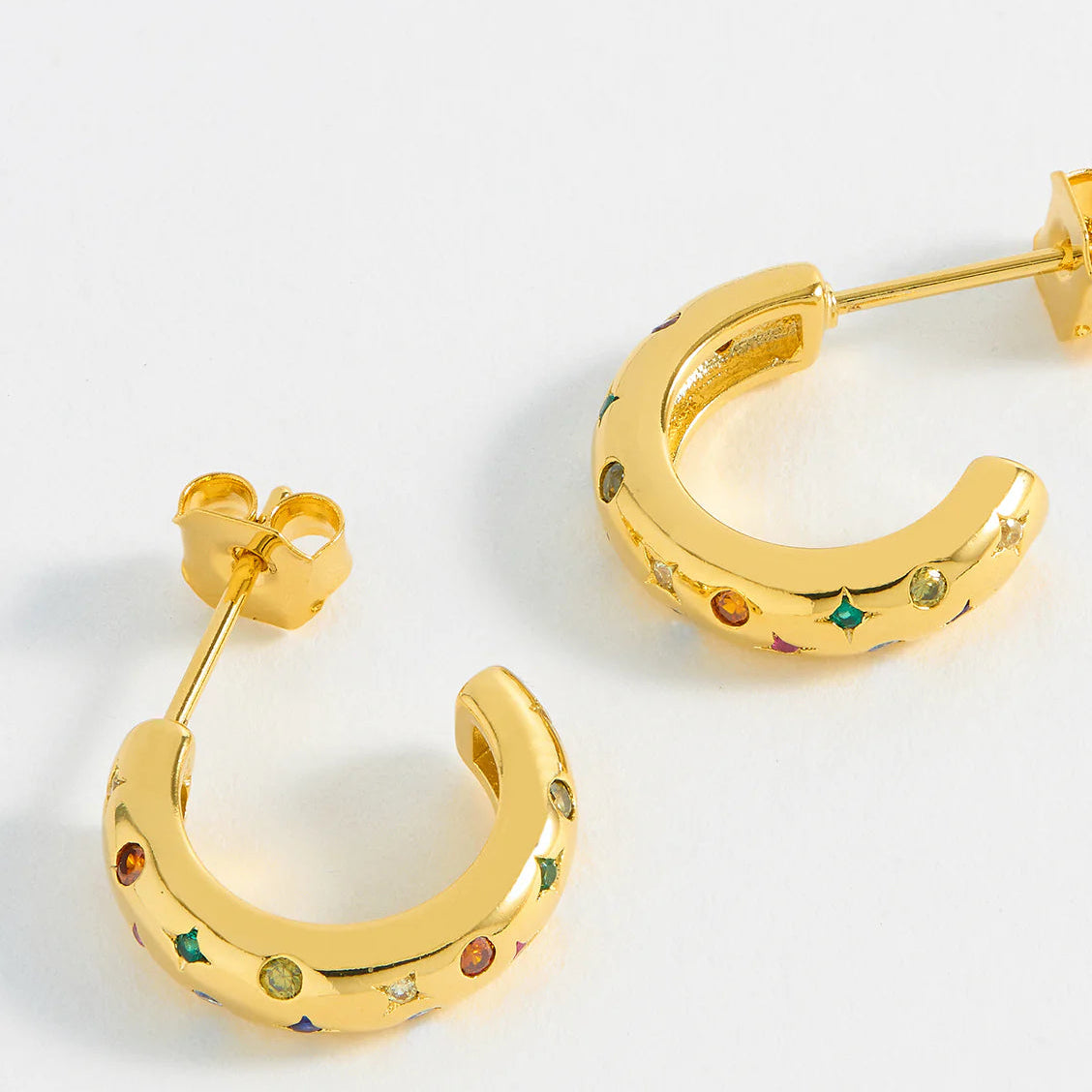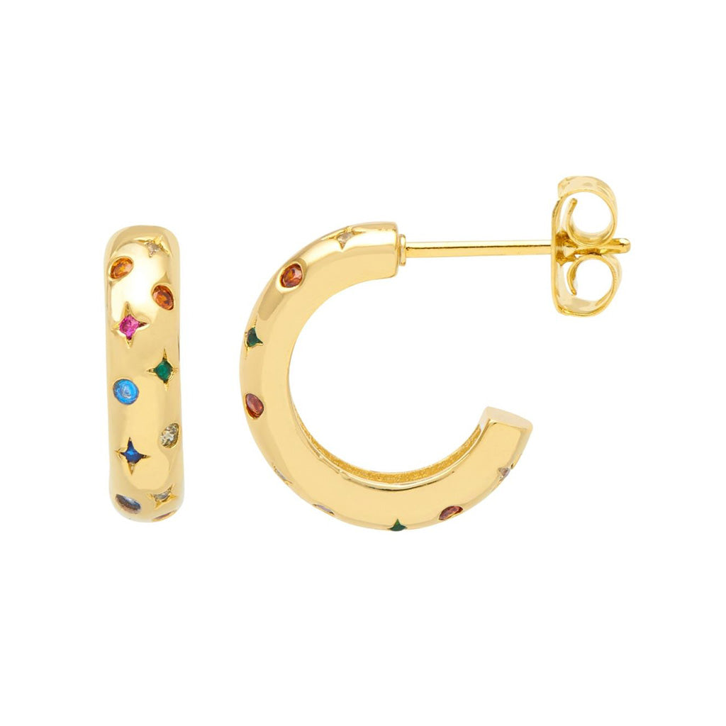 Brighten up your outfit with our gold plated Chubby Rainbow Celestial Hoops. Featuring a small, thick hoop earring with multi-coloured gems, these hoops embody fun, playfulness and joy.