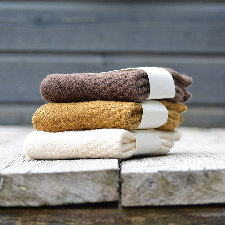 Thick wool socks made with an eco-friendly blend of recycled wool from clothing and virgin cotton made with leftover strands of cotton. They boast the generous thickness of wool socks but are more durable; perfect with boots for outdoor activities like camping and trekking.