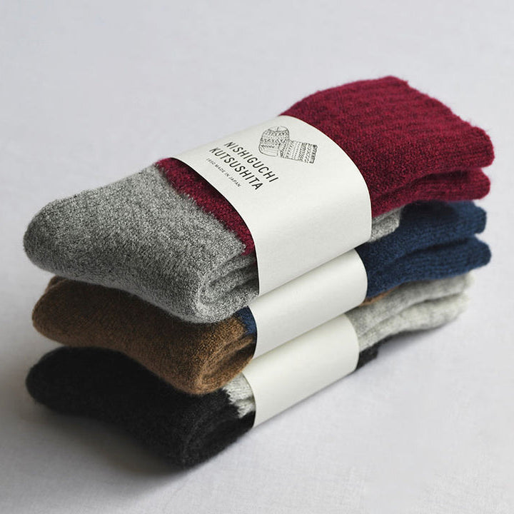 These socks are made from soft kid mohair and wool-spinning yarn that is less than one year old. The features of mohair are soft and highly warm, and by blending with wool, it is finished in thin but warm socks. Pile the part of the foot, ankle has become a leg warmer that was double woven.