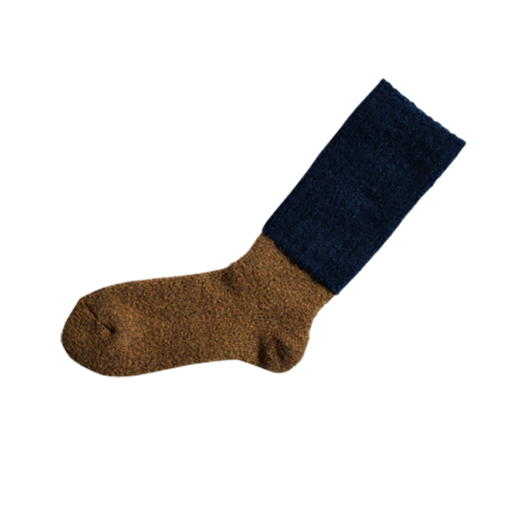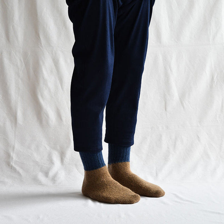 These socks are made from soft kid mohair and wool-spinning yarn that is less than one year old. The features of mohair are soft and highly warm, and by blending with wool, it is finished in thin but warm socks. Pile the part of the foot, ankle has become a leg warmer that was double woven.