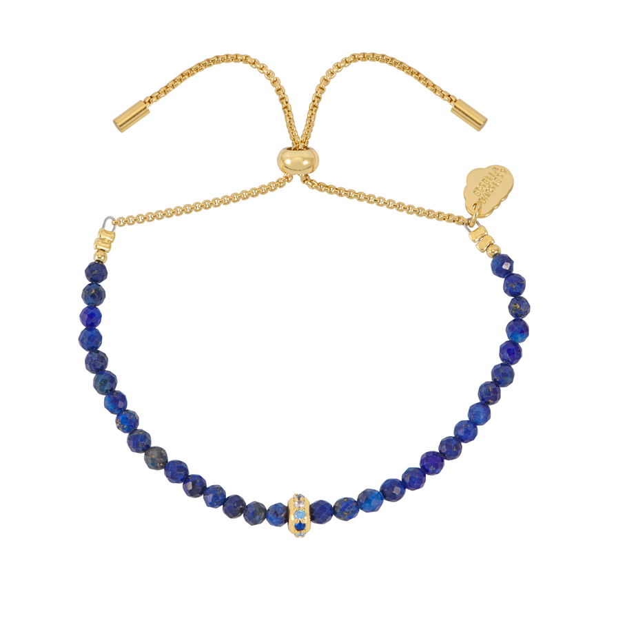 The best-selling Amelia bracelet just got a chic update, now including a gold-plated disc charm studded with CZ stones. Threaded with Lapis Lazuli beads, said to promote calmness, this sophisticated piece will elevate any outfit. The slider fastening means it's suitable for any wrist size, making it an easy gifting option.