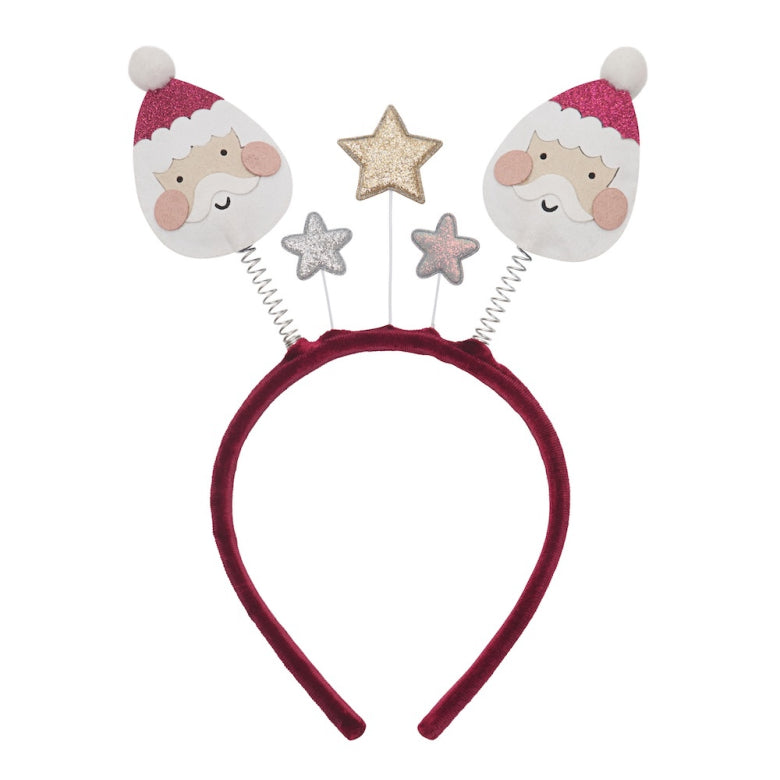 Burgundy velvet fabric wrapped alice band adorned with three central glitter fabric stars plus two sturdy springs topped with fabric crafted jolly Santa faces complete with glitter hats topped with tiny pom poms Alice band sized to fit ages 3-10 years