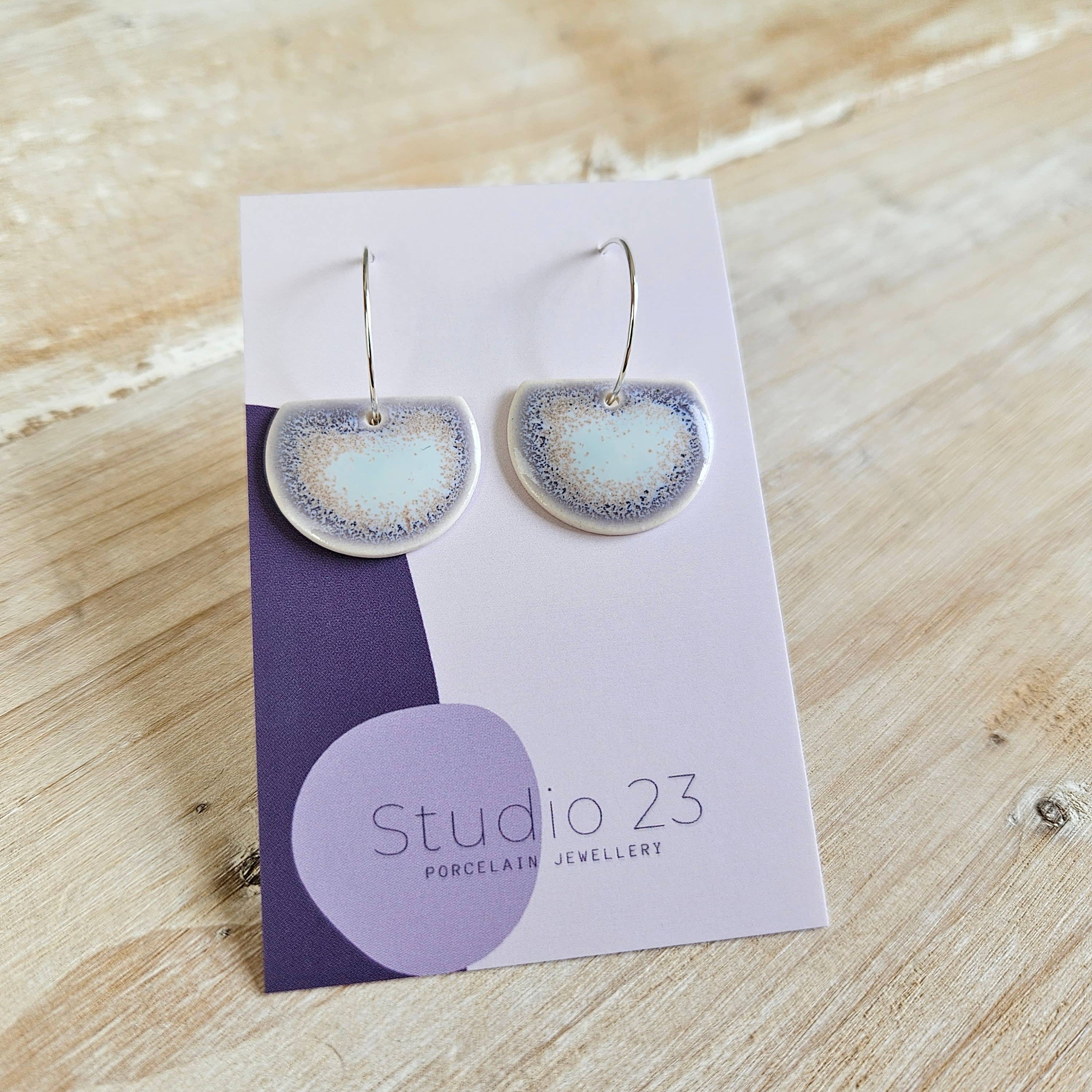 Pair of semi-circular porcelain clay drop earrings glazed in a range of decorative pastel stoneware glazes.