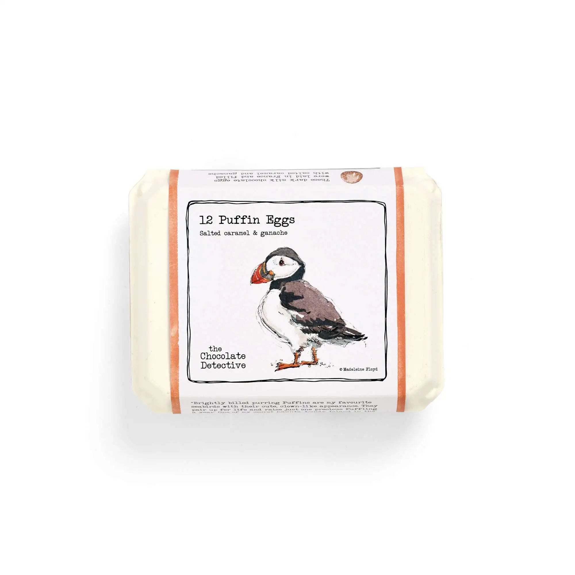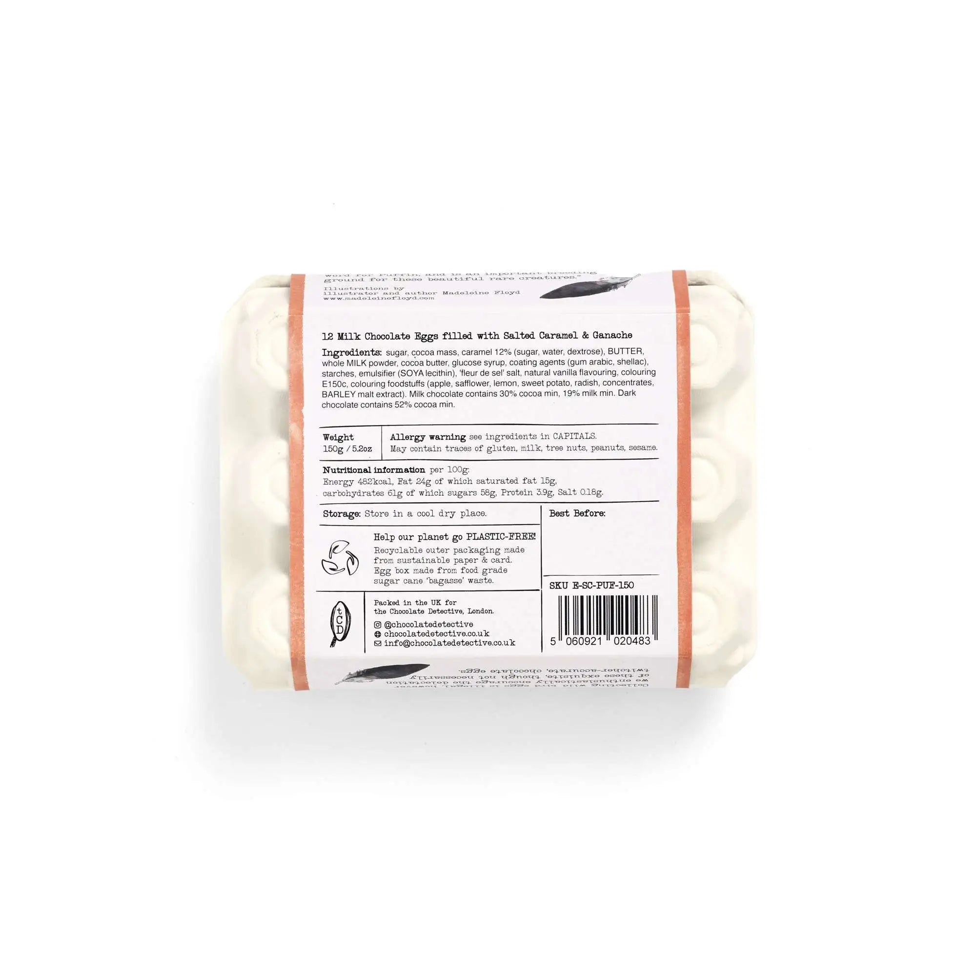 12 Chocolate Eggs filled with Salted Caramel. Layers of dark and milk chocolate are then filled with ganache and gently salted caramel before being wrapped in a fine sugar shell and life-like speckles.