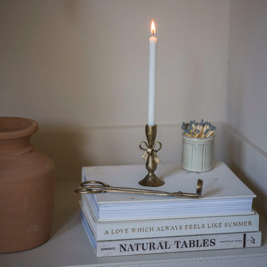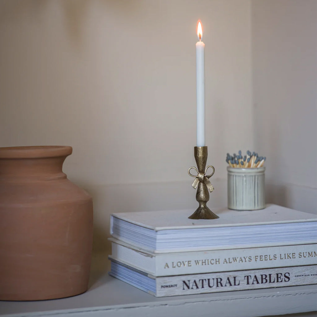 A charming addition to festive tables and year-round displays, this antique brass finish candle holder is cast from iron in a classic silhouette, complete with a subtle bow detail at the base. The lightly textured surface and warm patina bring character and elegance to shelves, mantels or dining settings.