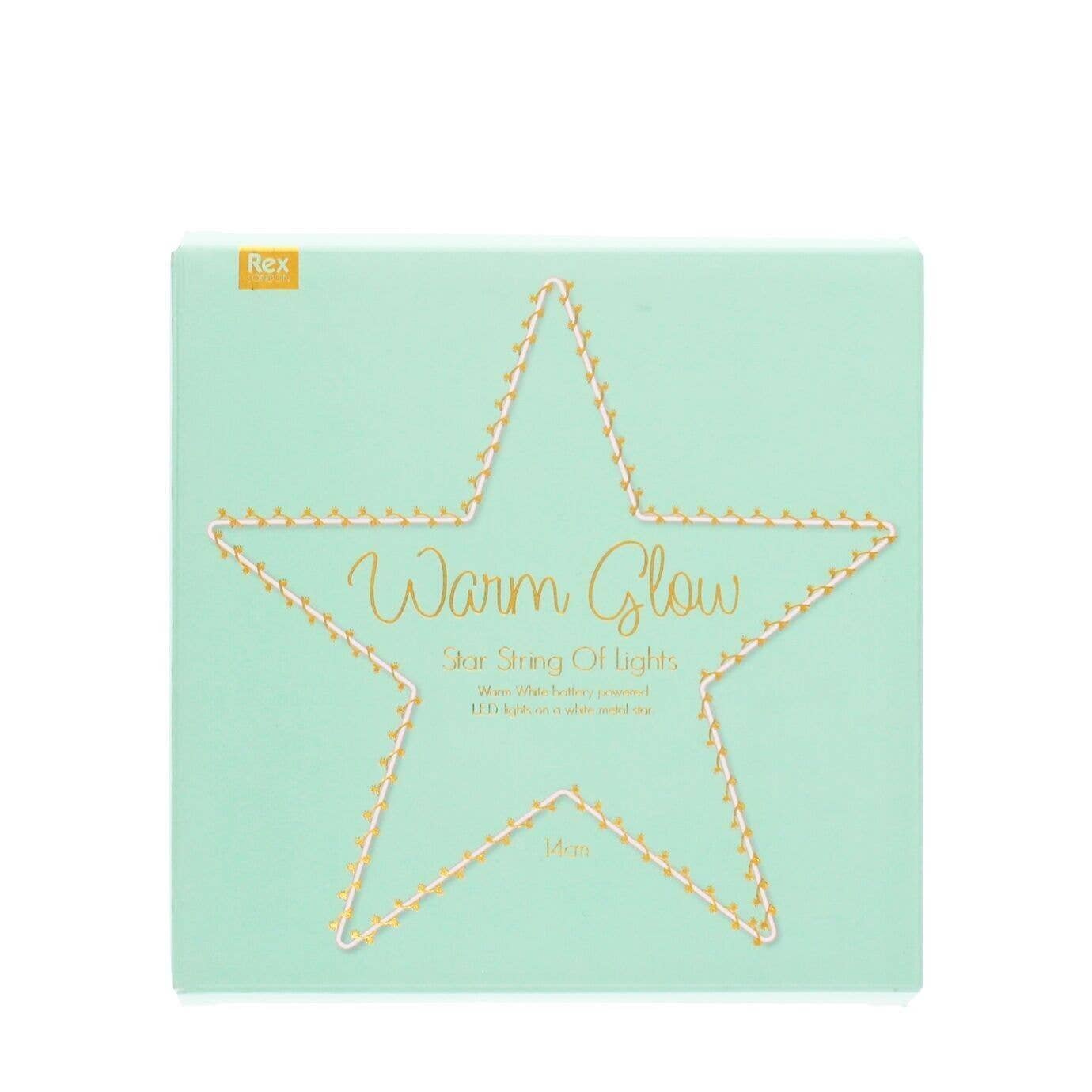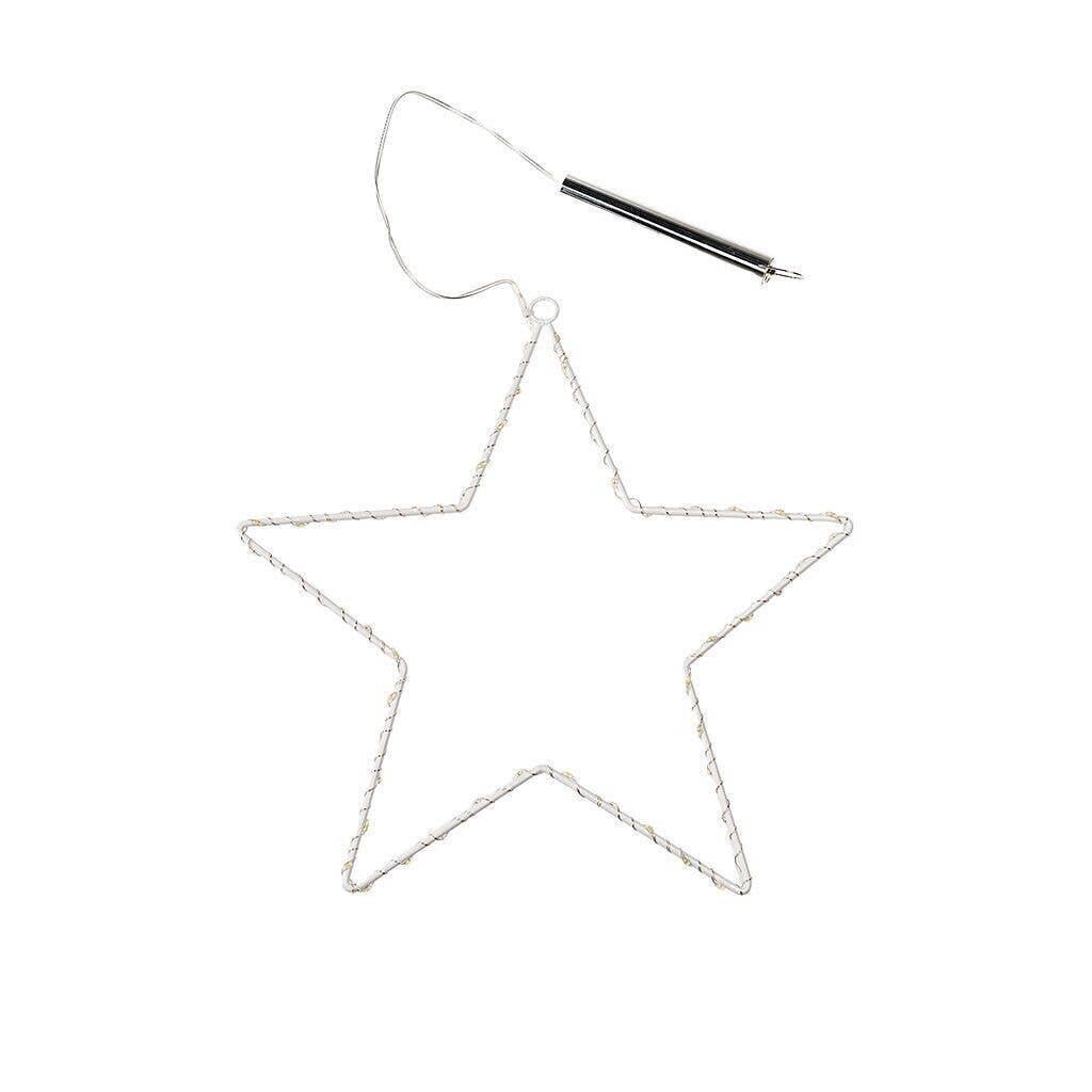 White metal star-shaped hanging decoration with a battery-powered string of LED warm white lights wrapped around it.