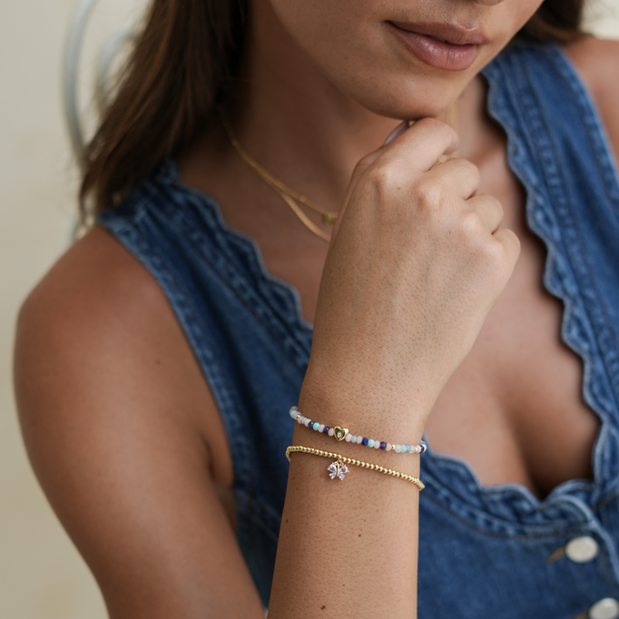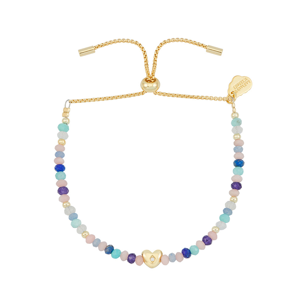 Remind yourself how loved you are with this Pastel Gemstone CZ Heart Amelia Bracelet. Featuring tiny multi-coloured gemstones (Amazonite, Pink Opal, Blue Aventurine, Lapis Lazuli, and Jade) surrounding a puffy heart with a CZ centre, this colourful piece will bring all the good vibes and make a great addition to your stack.