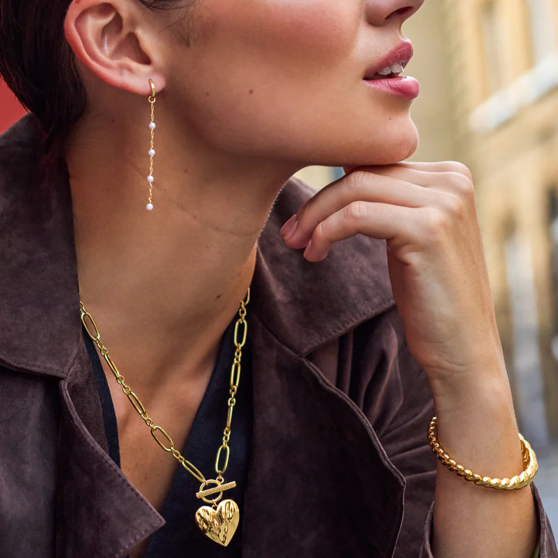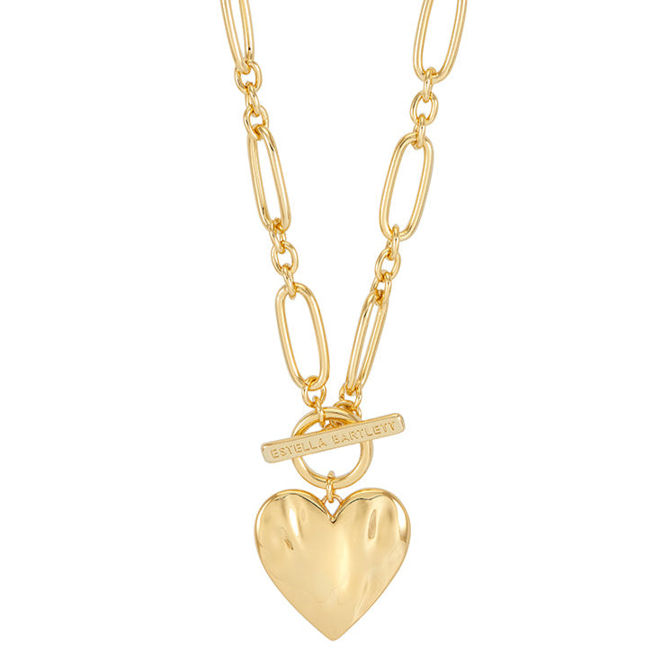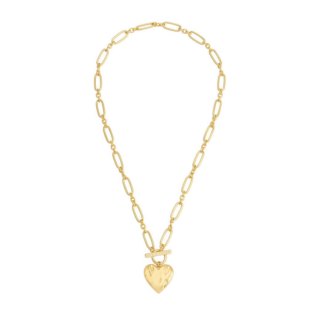 Make a statement with our gold-plated Oversized Molten Heart T-Bar Necklace. Featuring a unique, large textured heart design that mimics molten metal, this striking necklace will add a playful, romantic touch to any outfit.