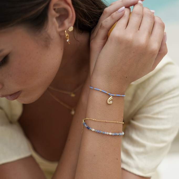 Get an effortless stacked look with the Pearl and Blue Aventurine Duo Bracelet. Featuring a simple satellite chain, luscious freshwater pearls and aventurine beads in different shades of blue, wear this when your outfit needs a chic pop of colour.