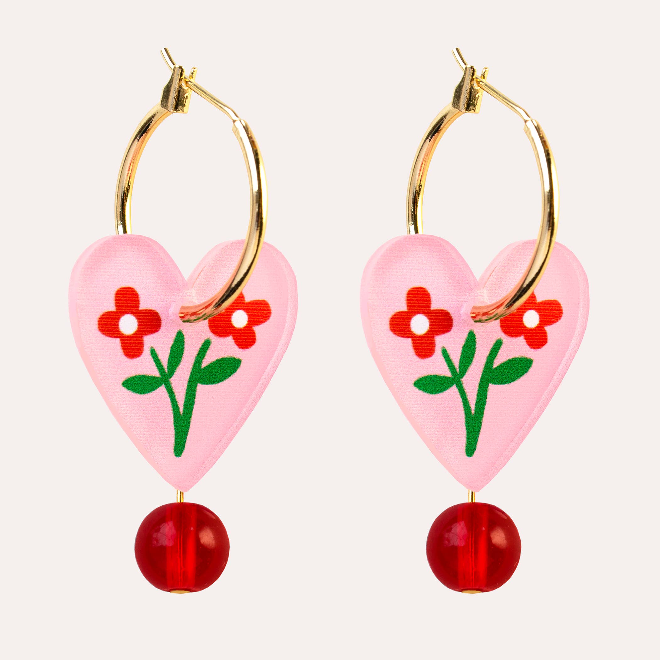 Add a joyful pop of colour to everyday outfits with these heart charm hoop earrings, featuring an illustrated pink floral heart charm finished with a sweet red glass bead that gently sways as you move. Bright, playful and full of personality, these heart earrings are perfect for celebrating love and make a thoughtful jewellery gift for her. Lightweight and comfortable to wear, the gold-plated hoops add an elegant finish while keeping these earrings easy to style all day long.