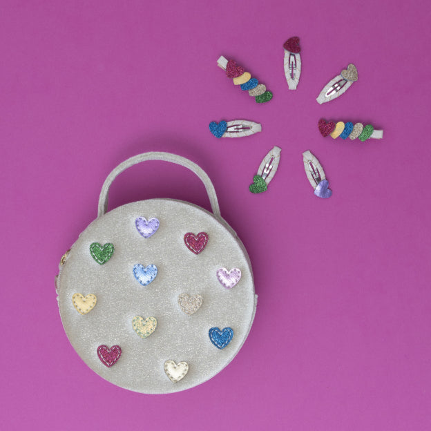 Our cheerful new Jazzy hearts bag features a multicoloured heart design sure to brighten up any outfit! Complete with a carry handle and a crossbody strap, this beautiful bag is the ideal colourful companion for little ones on the go! Crafted from soft glitter speckled velvet and embellished with multicoloured fabric hearts in a mix of glitter and metallic fabrics Zip top closure.