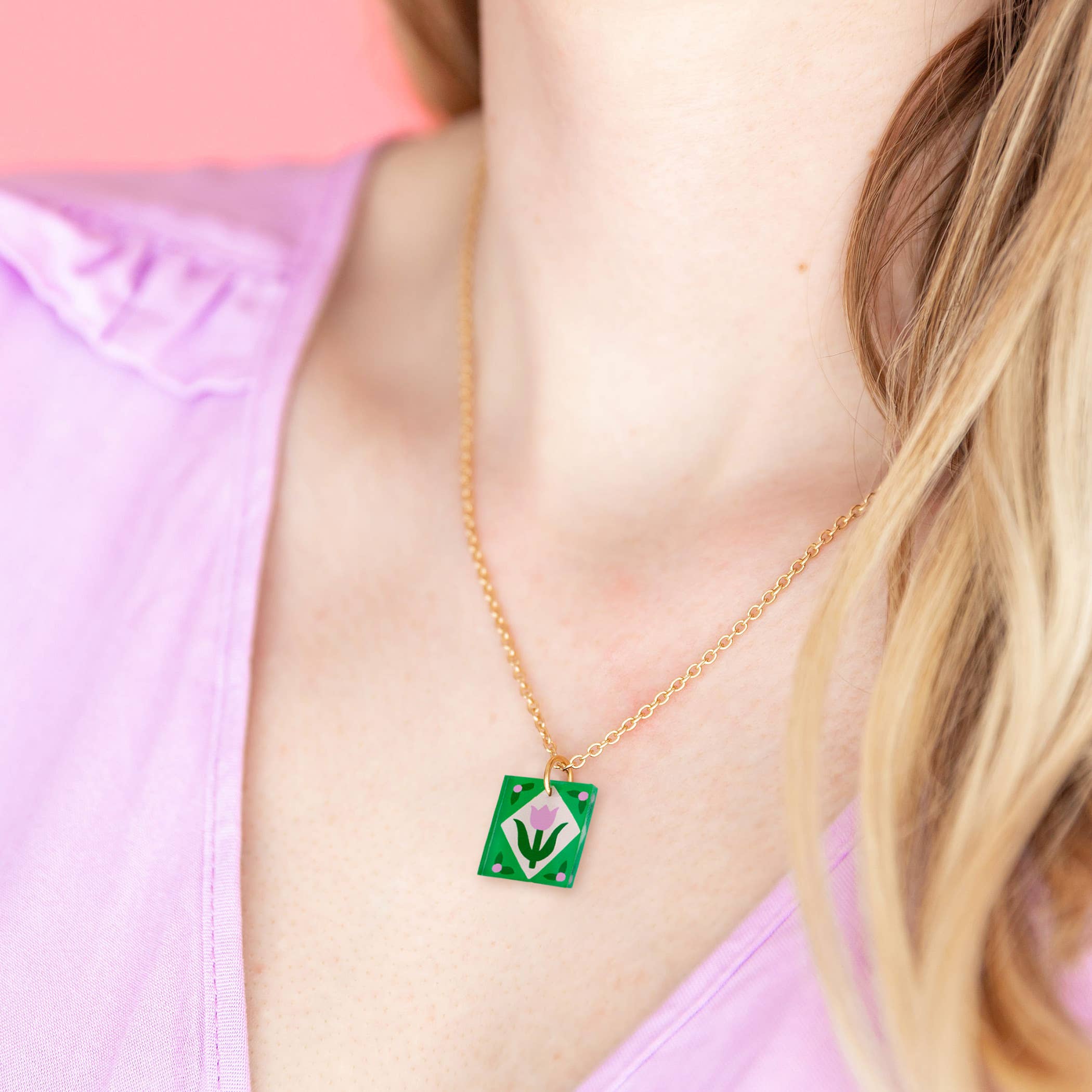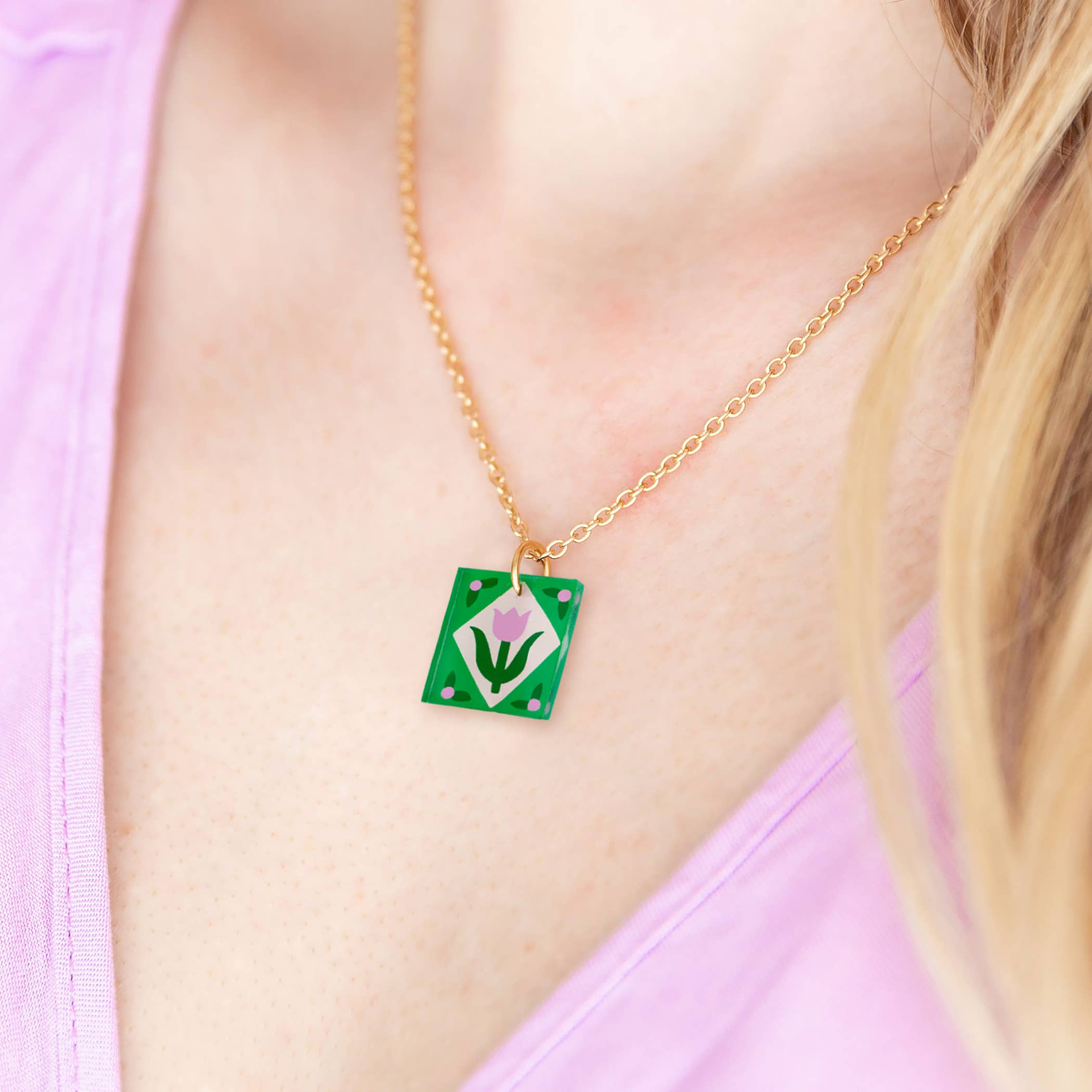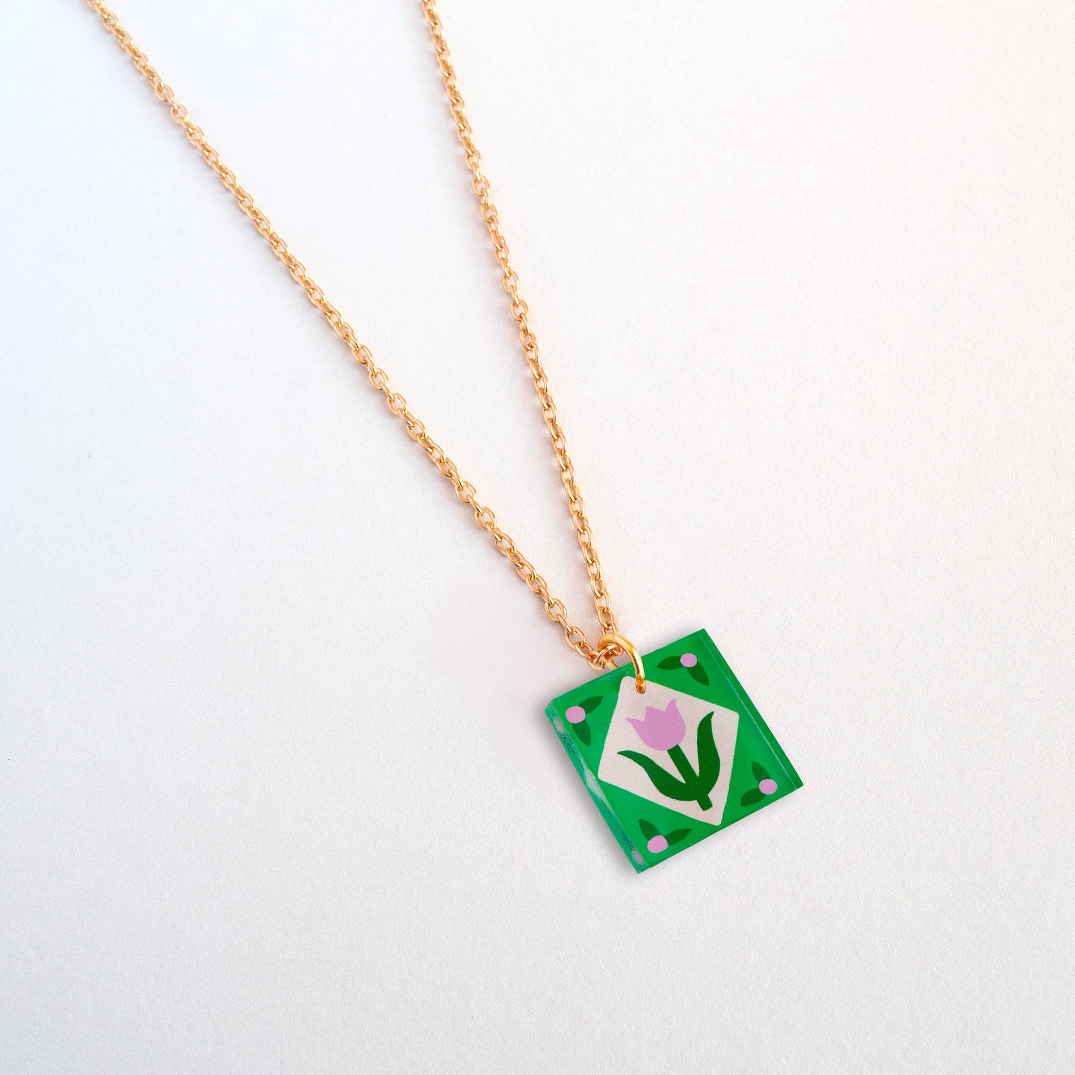 Add a fresh pop of colour to everyday outfits with this folk floral charm necklace, featuring a hand-illustrated flower motif on a green and white patterned background. Finished with a delicate gold-plated chain, this illustrated pendant necklace is lightweight, eye-catching and perfect for elevating daily style or layering with other jewellery.