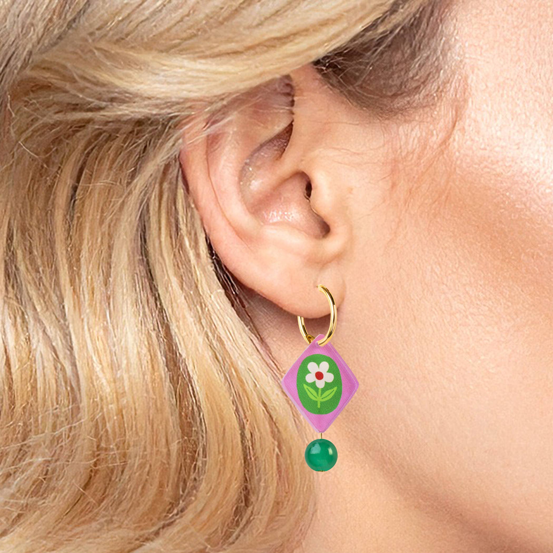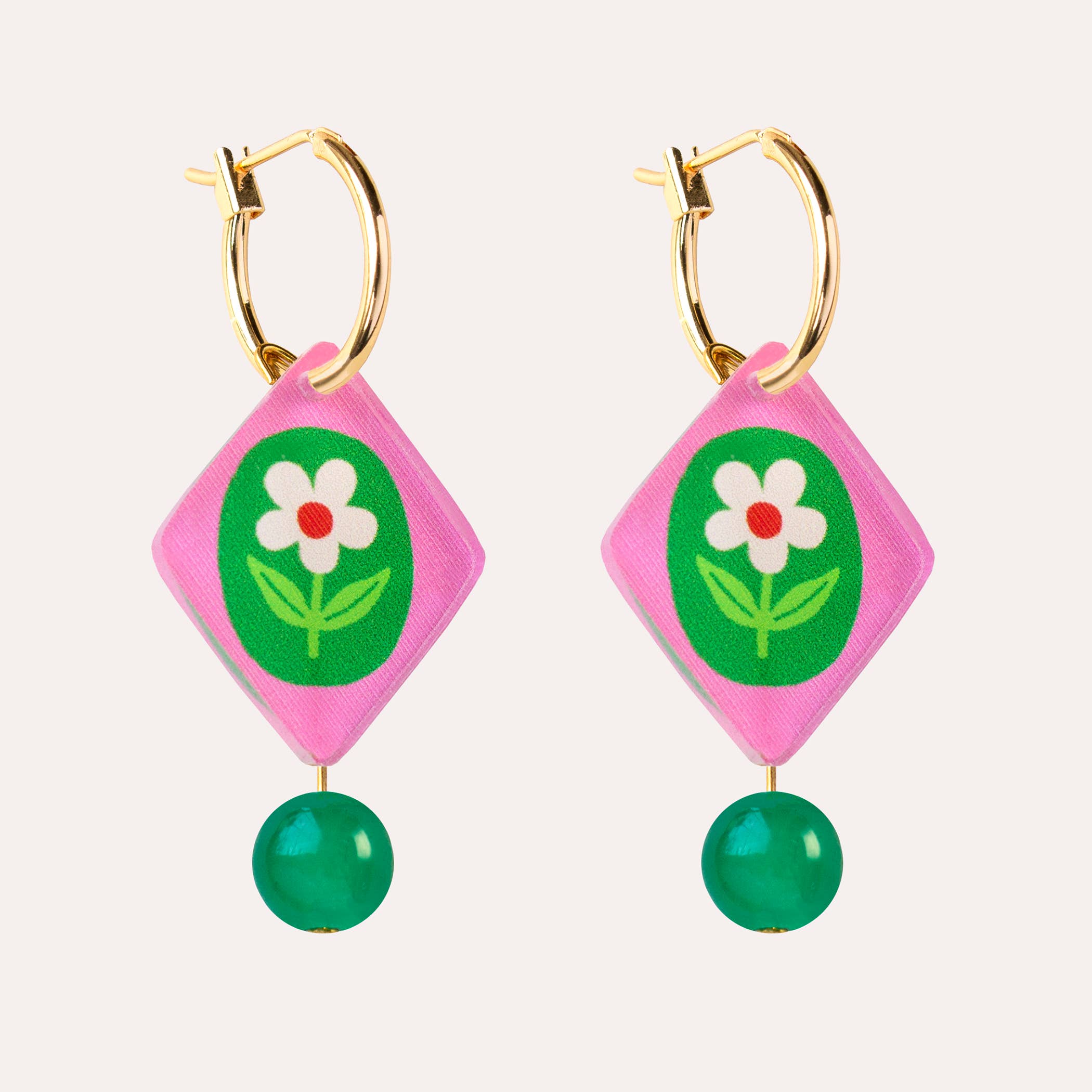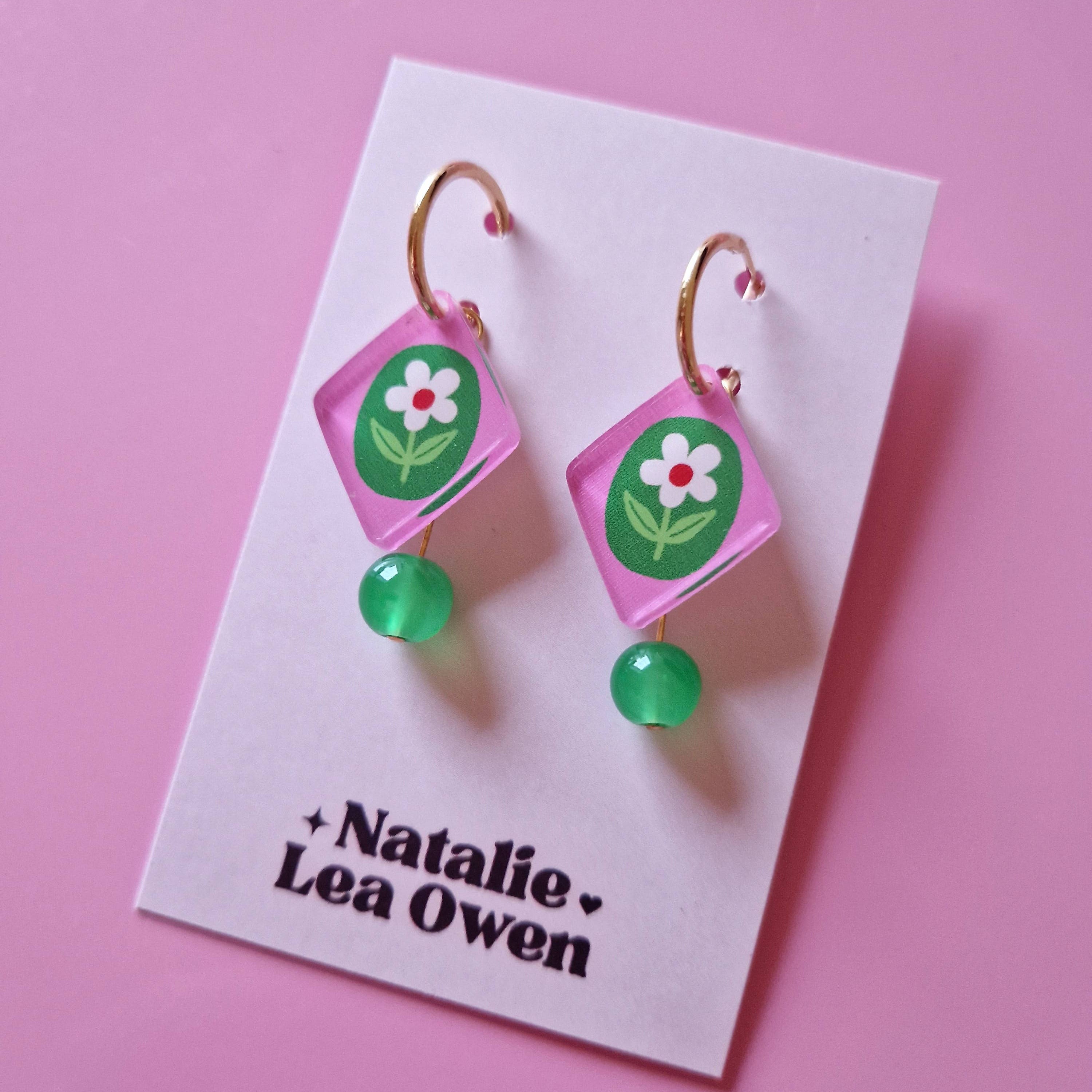 Add a joyful pop of colour to everyday outfits with these floral charm hoop earrings, featuring a pink and green diamond-shaped flower charm finished with a dark green glass bead detail. Designed to gently sway as you move, these illustrated earrings have playful movement and a bright, eye-catching feel that instantly elevates daily style. Lightweight and comfortable to wear, the gold-plated hoops add an elegant finish while keeping these earrings perfect for all-day styling.