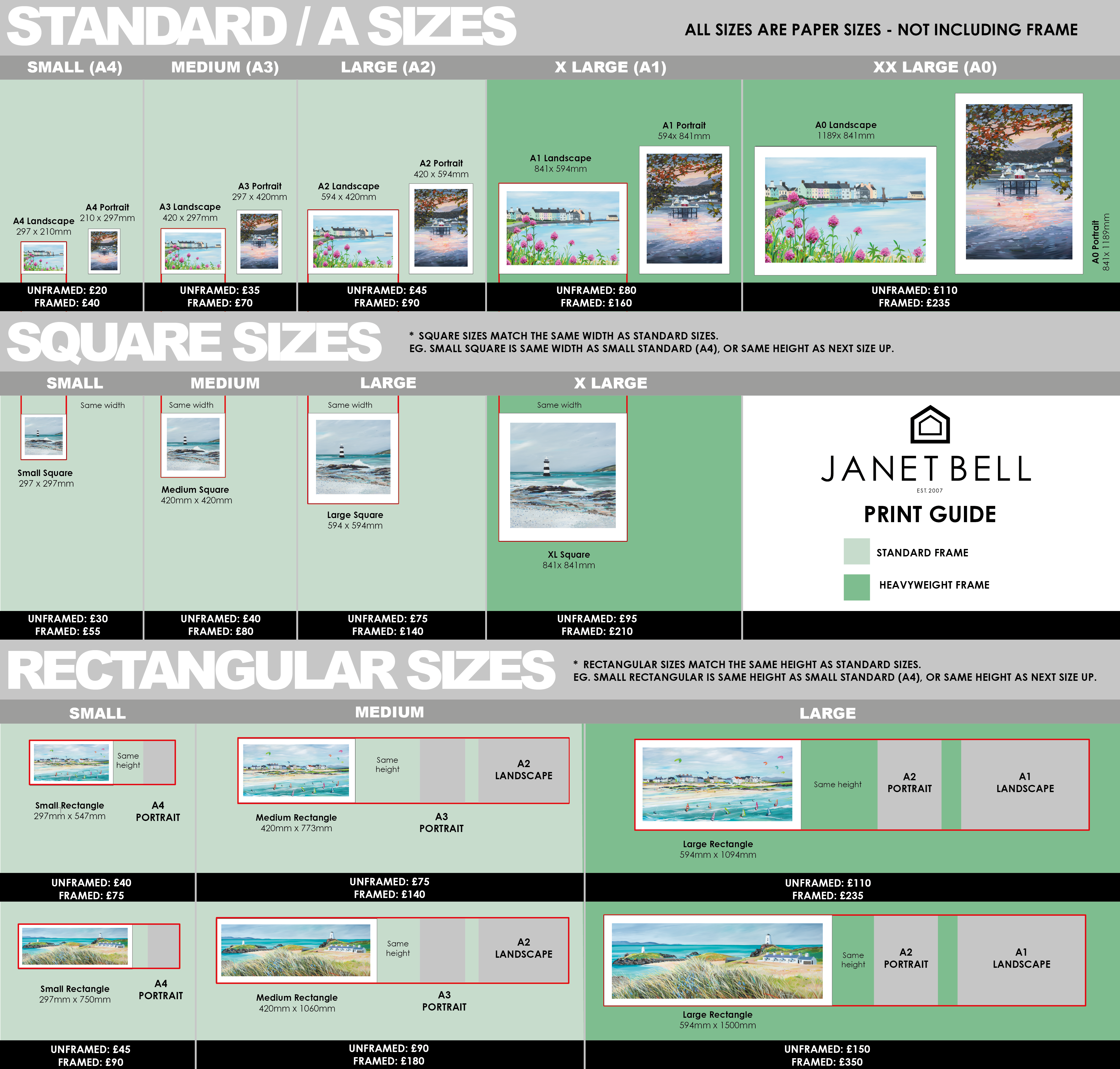 Giclée prints, (printed in house) on Somerset Velvet textured, fine art paper. Each print is signed and titled by Janet Bell. A4, A3, A2 sizes sealed in a clear bag and sold flat with a card backing. A1 and A0 prints sold rolled in a tube.