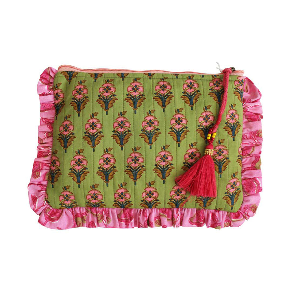 The main body of the make up bag is a gorgeous lime green which makes the repeated pink flower block print pattern on the fabric really pop. The block print fabric is complimented by the contrasting pink ruffle frill trim and a pink tassel beaded zip pull