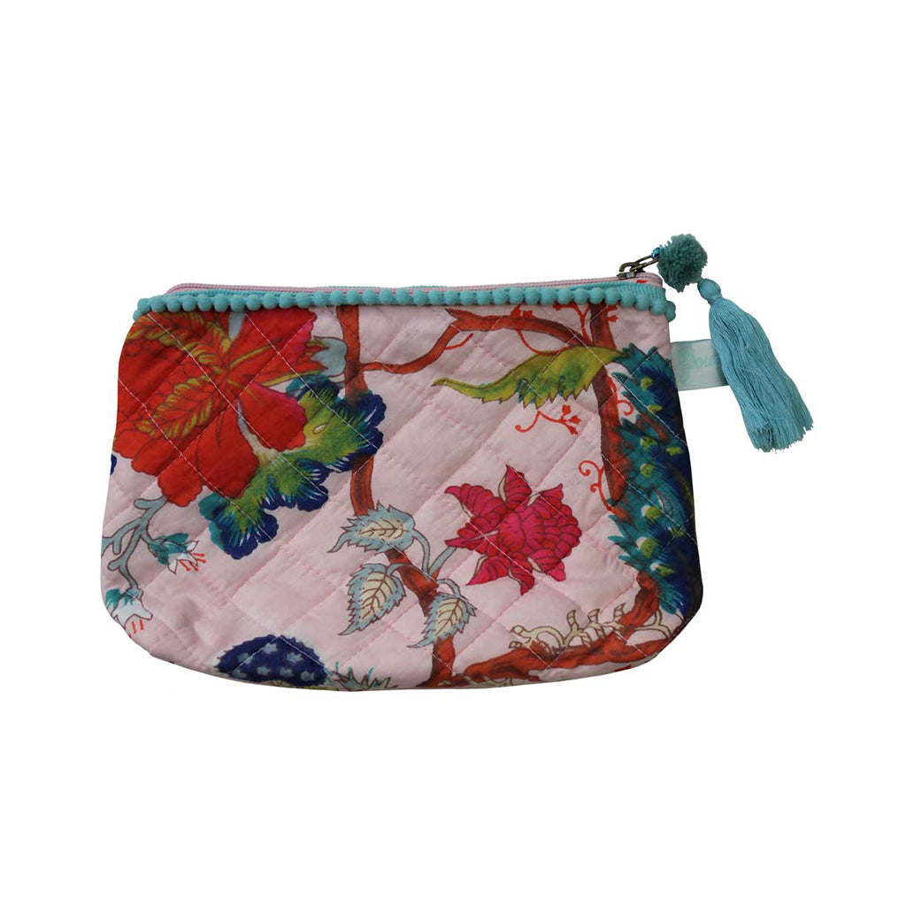 This quilted bag has a silky lining and an inner slip pocket. The zip pulls with a pom-pom and pearl-trimmed tassel and there is a blue pom-pom trim along the top.