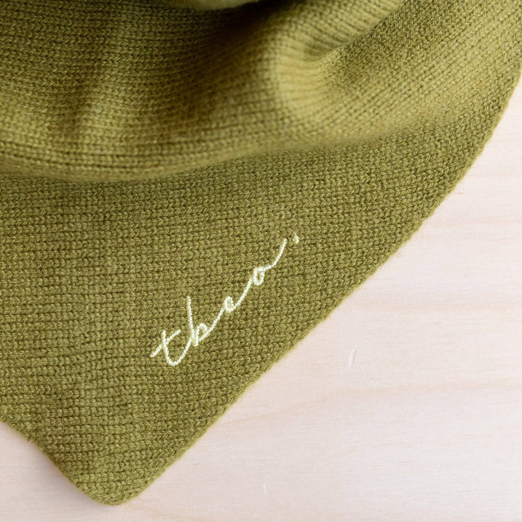 TBCo triangles scarves are the perfect finishing touch, and one of our best-selling items. Easily add interest and elevate your outfit with this olive triangle scarf. It features an embroidered TBCo logo, and is knitted from soft and warm merino wool. It can be tied in multiple ways for endless styling options.