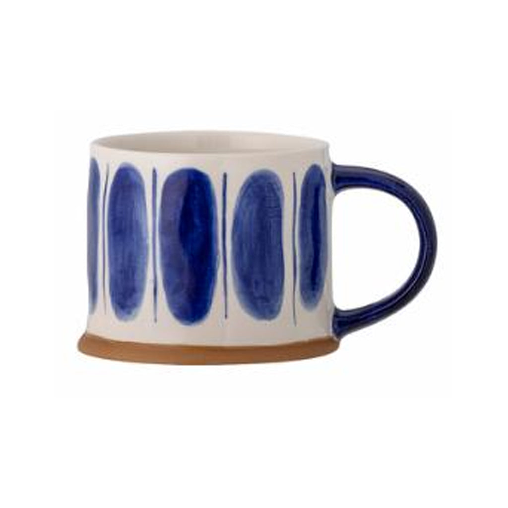 Decorated with motives in blue colours and a natural (not glazed) feet. Perfect to mix and match with each other or with your favourites mugs at home.