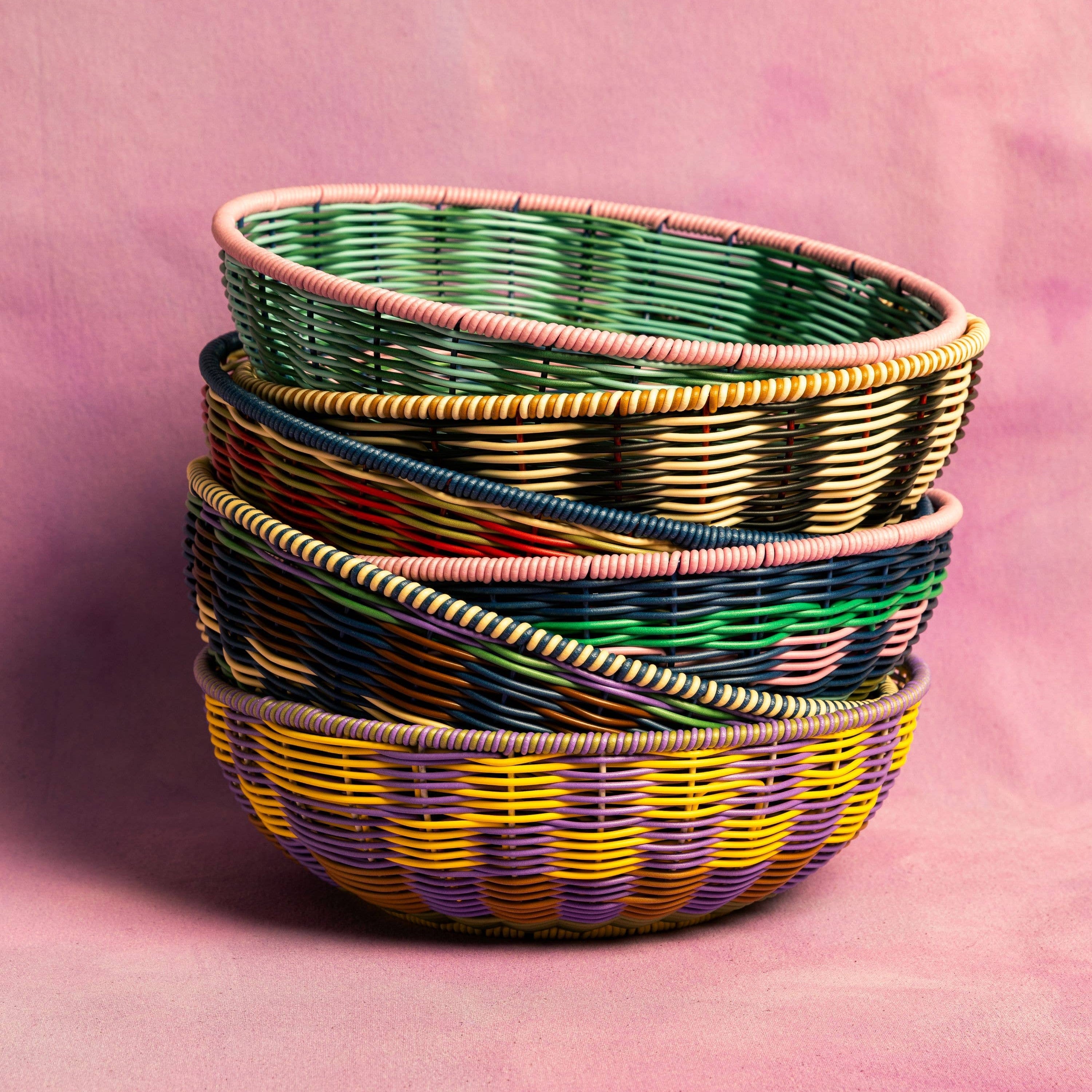 Each bowl is hand woven from coloured polypropylene, creating unique patterns that celebrate joyful design and everyday functionality.