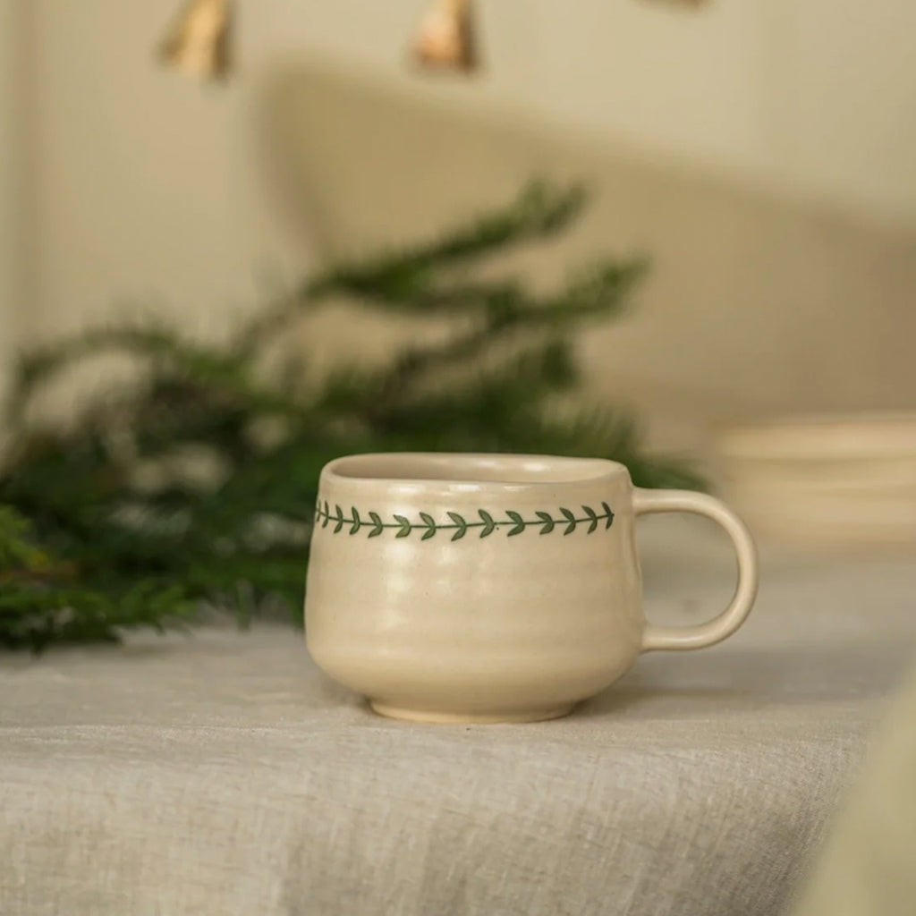 Crafted with a matte cream glaze and hand painted wreath detail, each ceramic mug has a softly unique finish. The gently rounded shape and subtle seasonal touch make it ideal for festive gifting, winter collections and homeware displays - perfect for warm drinks, teas or hot chocolates throughout the autumn and winter months.