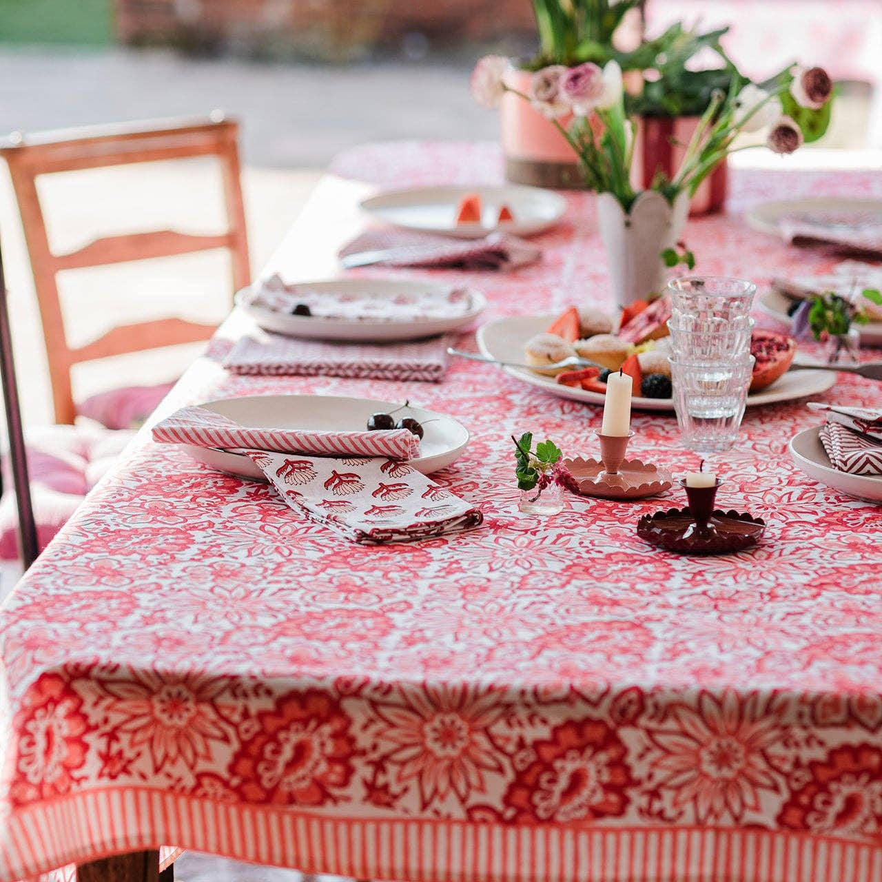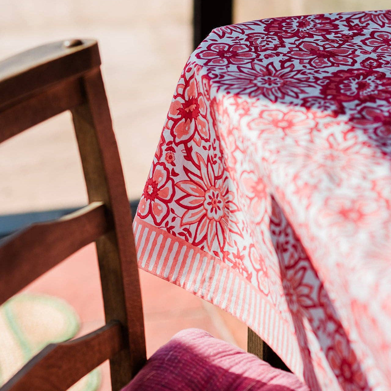 This Coral Meadow tablecloth blends warmth and vibrancy with handcraft elegance.