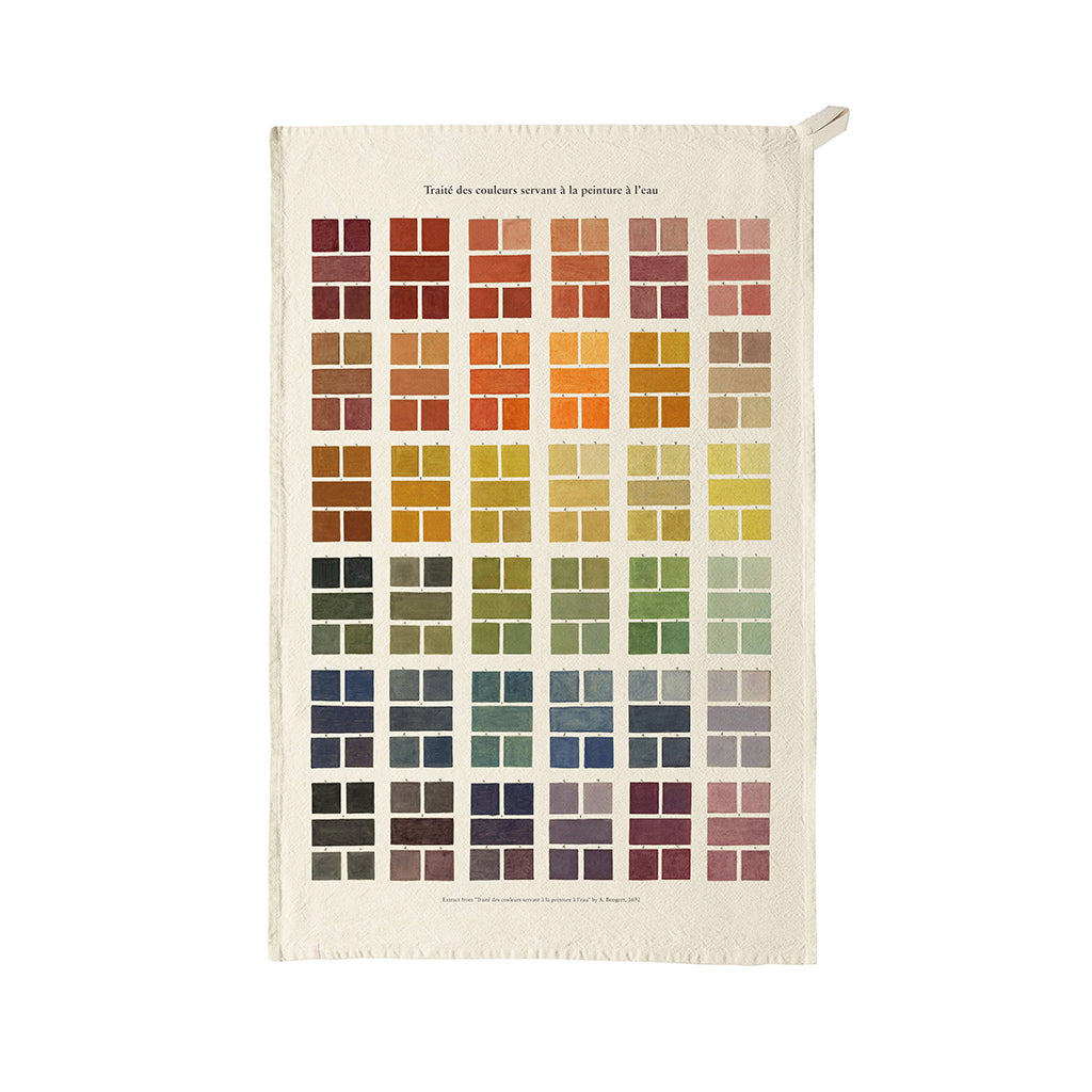 This Watercolour Swatches 100% organic cotton tea towel features artwork inspired by a vintage book written and illustrated in 1692 about mixing watercolours.