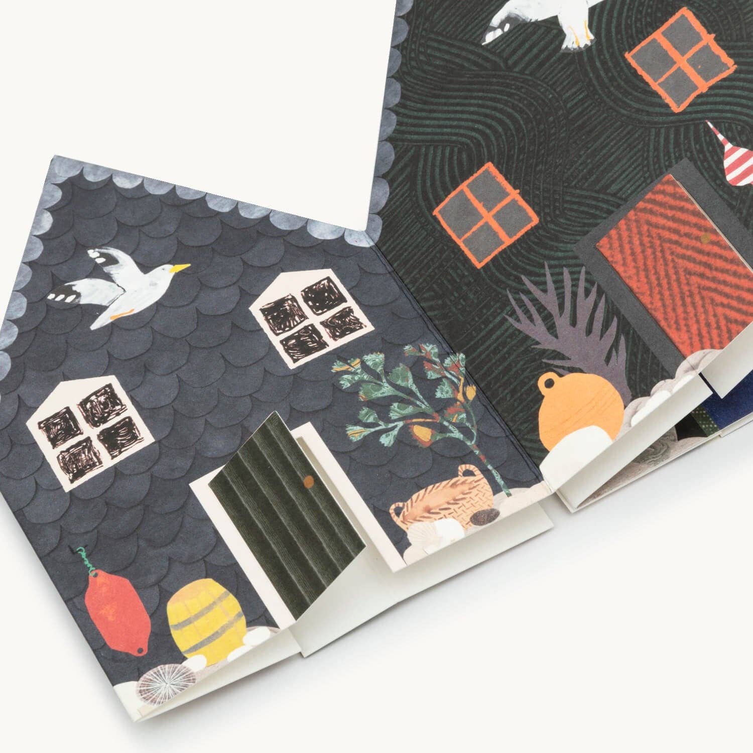 Featuring six fisherman's huts, each unique in its design with gorgeous attention to detail such as fish, shells, baskets and plants. Designed using a classic combination of oil pastels, badly pressed flowers, cut outs from a book about fisherman's jumpers and marbling.