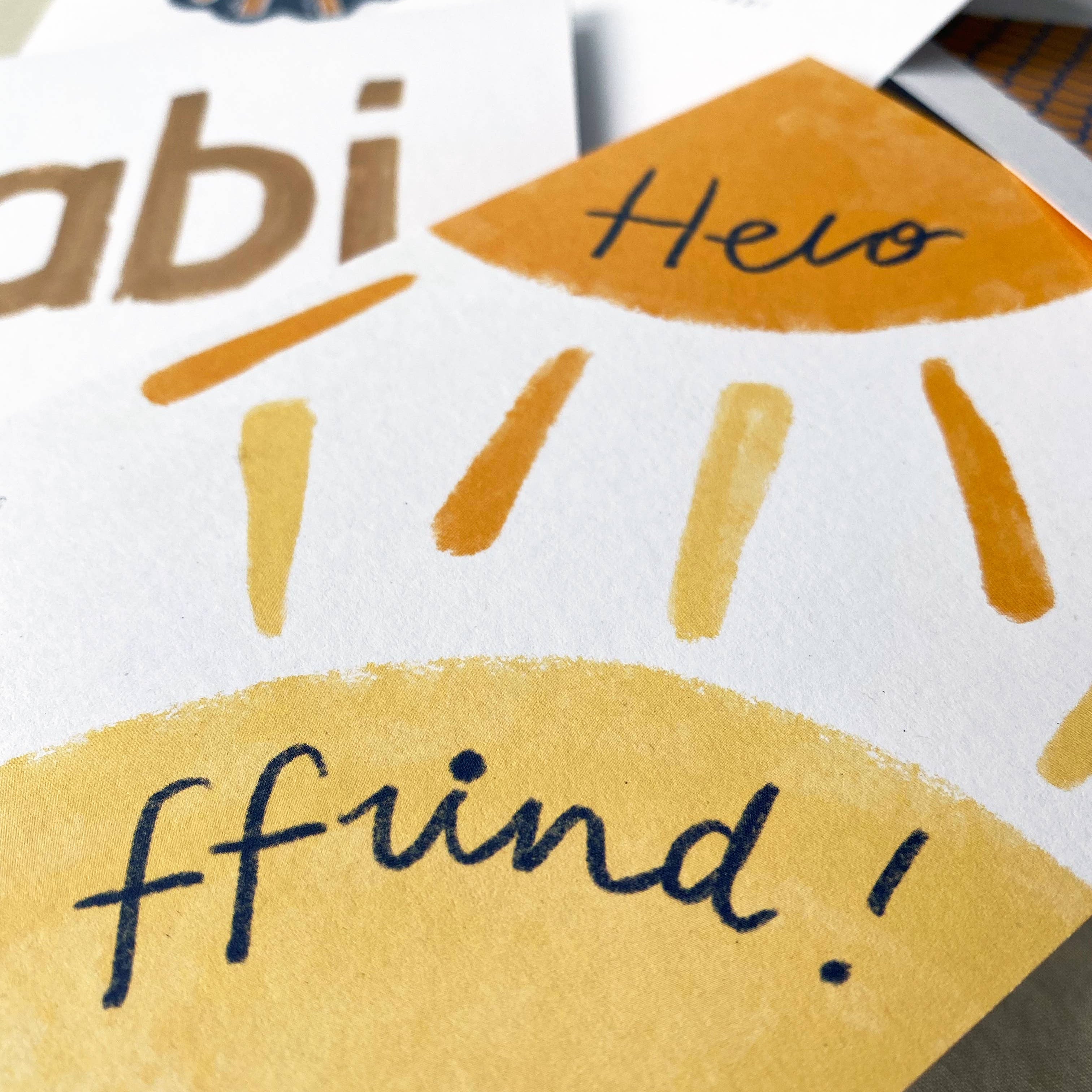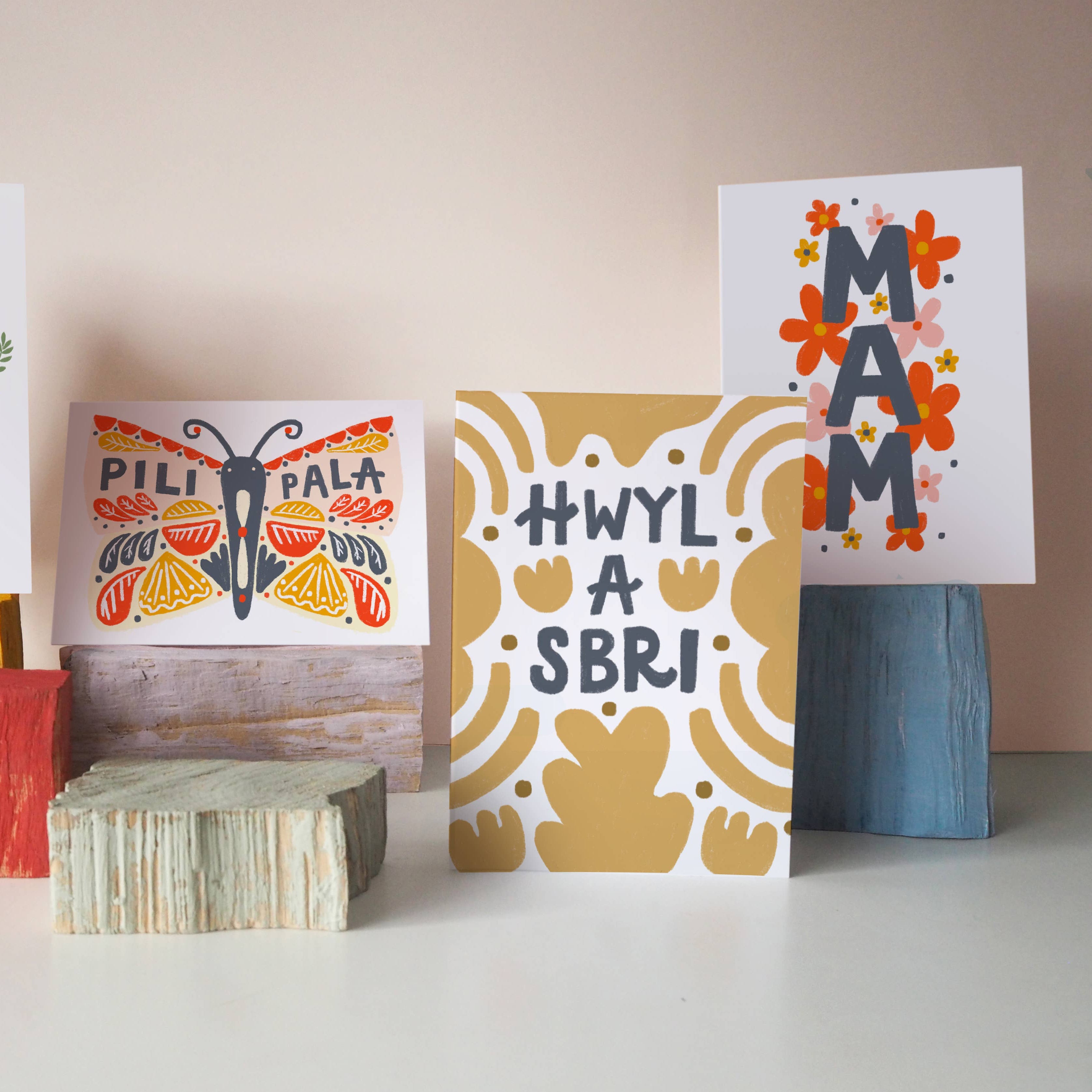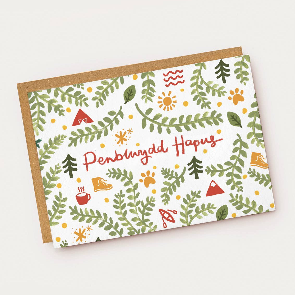 A fun illustrated Welsh language birthday card with nature motifs and cute little outdoor/camping icons.