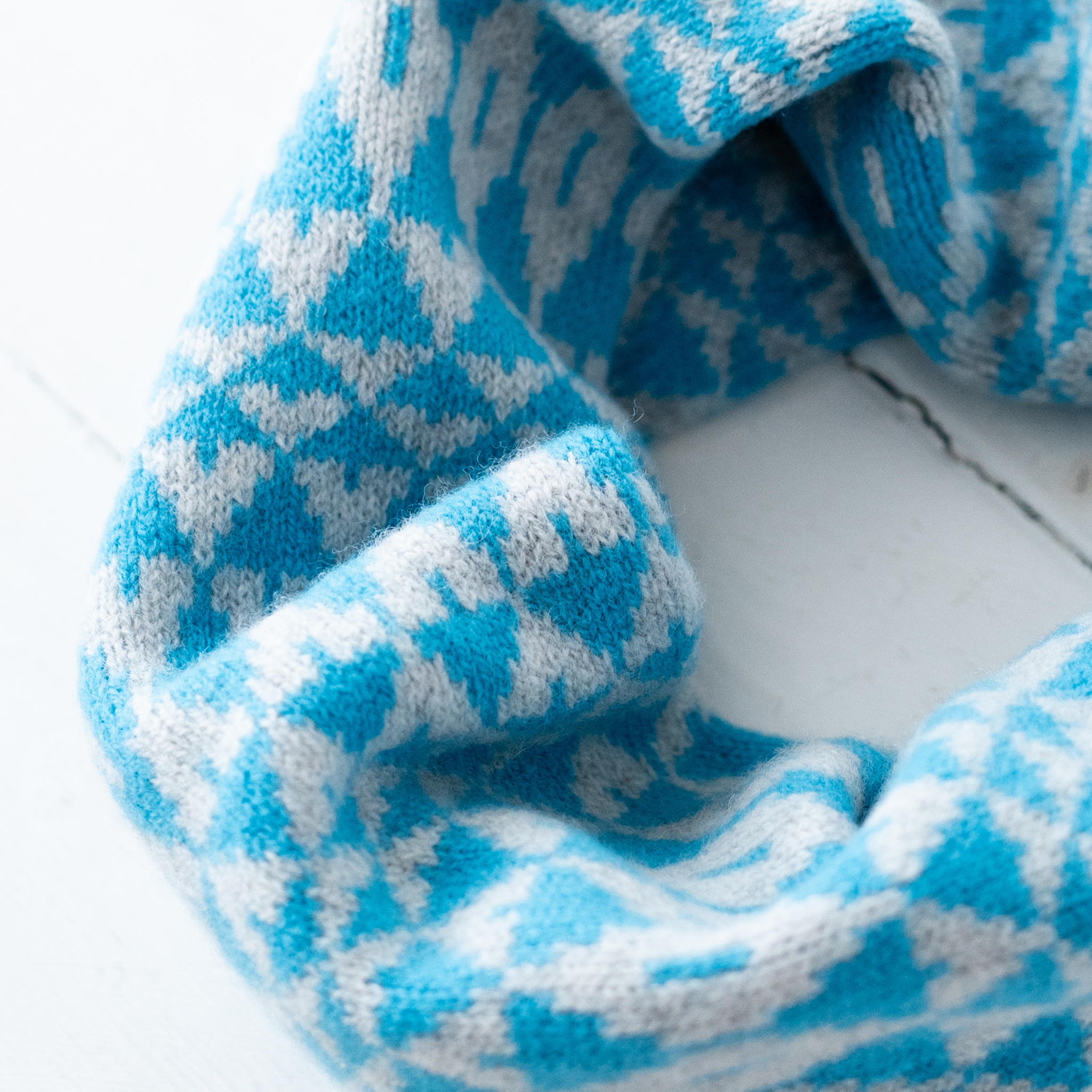 Brighten up your winter with this cosy cowl knitted in a geometric pattern, the perfect size to wear alone over a jumper or with a winter coat.