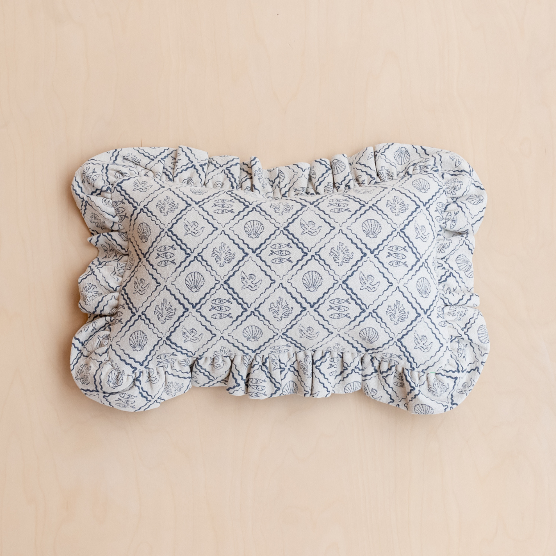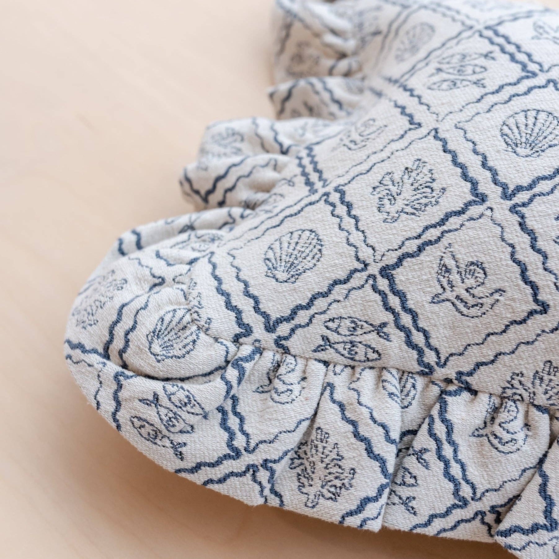 This blue and ecru jacquard cushion cover is woven from a durable blend of high-quality cotton and recycled mixed fibres. The soft rectangular shape, playful shell and trinket pattern, and delicate ruffled edge make it a versatile addition to any interior. Mix or match across sofas, beds and corners for easy updates with impact.