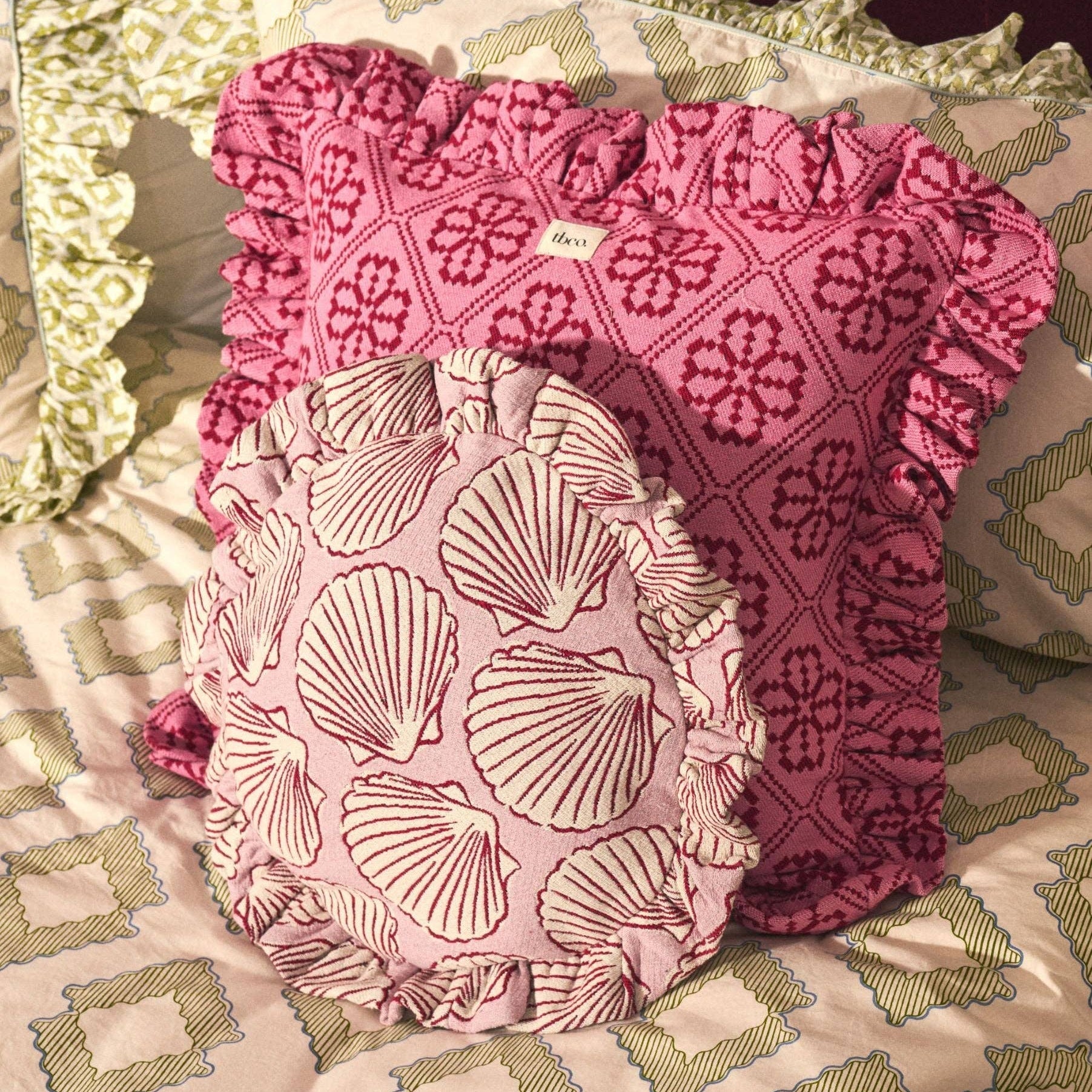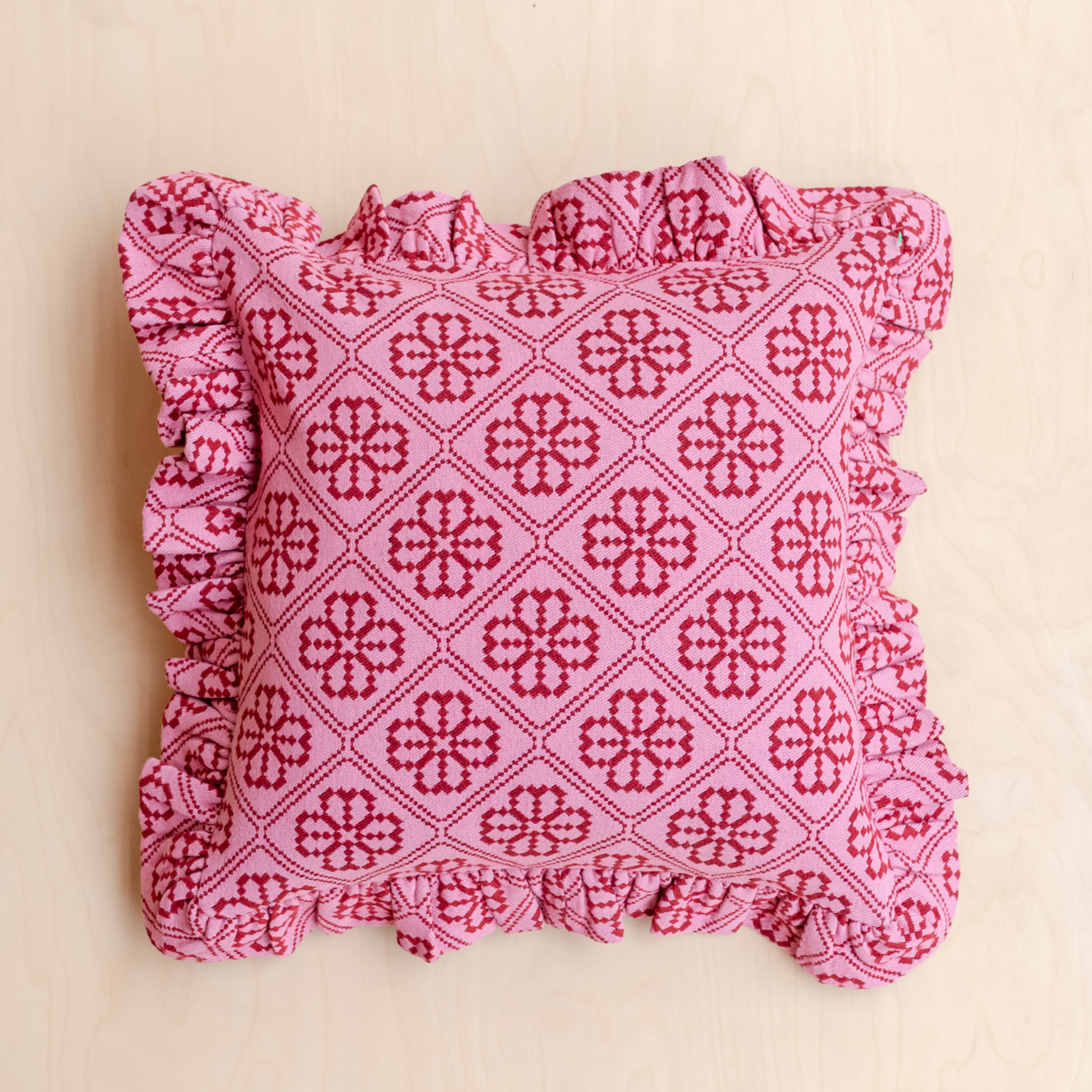 This pink and red floral jacquard cushion cover is woven from a durable blend of high-quality cotton and recycled mixed fibres. The soft square shape and delicate ruffled edge make it a versatile addition to any interior. Mix or match across sofas, beds and corners for easy updates with impact.