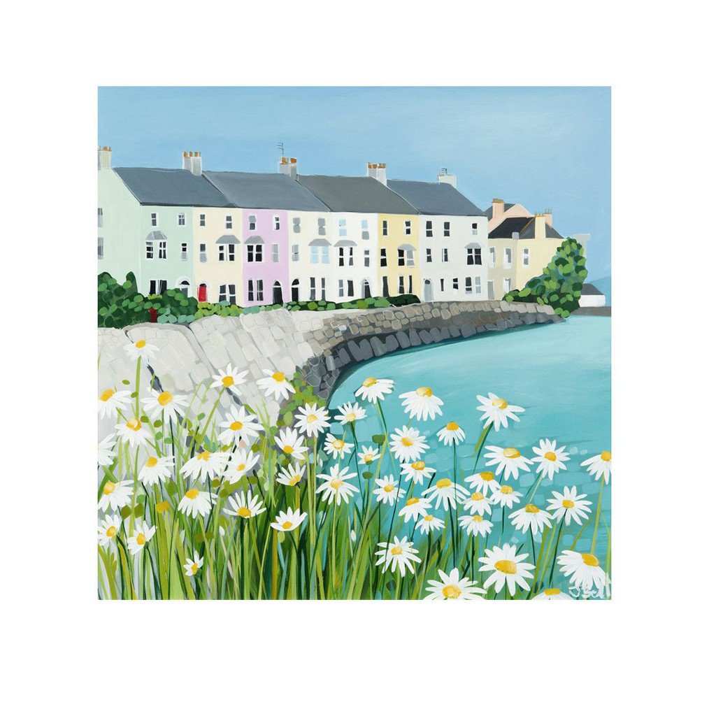This iconic view of Beaumaris’ pastel-coloured terrace is one of Janet Bell’s older prints (originally painted in colourful acrylic) and still a firm favourite. The blue waters of the Menai Strait and daisy foreground add to the instant sunshine effect of this contemporary piece.